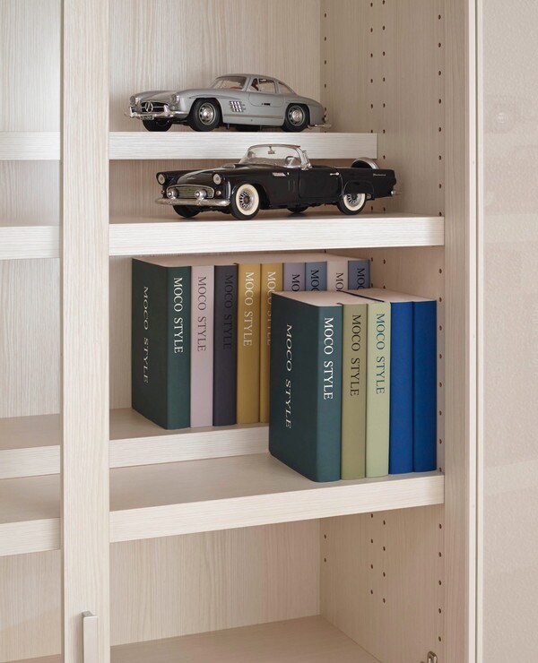 後部をストック専用として可動棚を本の寸法に合わせてセット。収納物と棚板の縦の空間を少なくすることで、収納力をアップすることができる。
