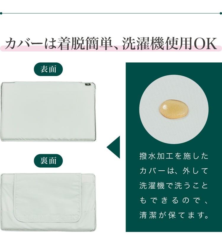 撥水加工を施したカバーは外して洗濯機で洗うこともできるので、いつでも清潔が保てます。