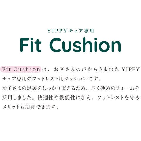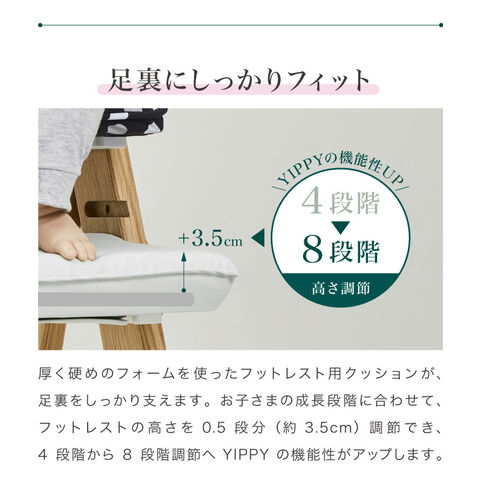 お子さまの成長段階に合わせて、フットレストの高さを0.5段分(約3.5cm)調節ができ、4段階から8段階調節へイッピーの機能性がアップするクッションです。