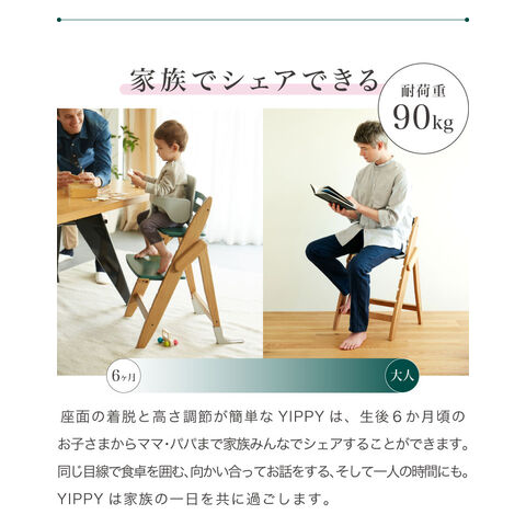 座面の着脱と高さ調節が簡単なイッピーは生後6か月頃のお子さまからママ・パパまで家族みんなでシェアすることができます。