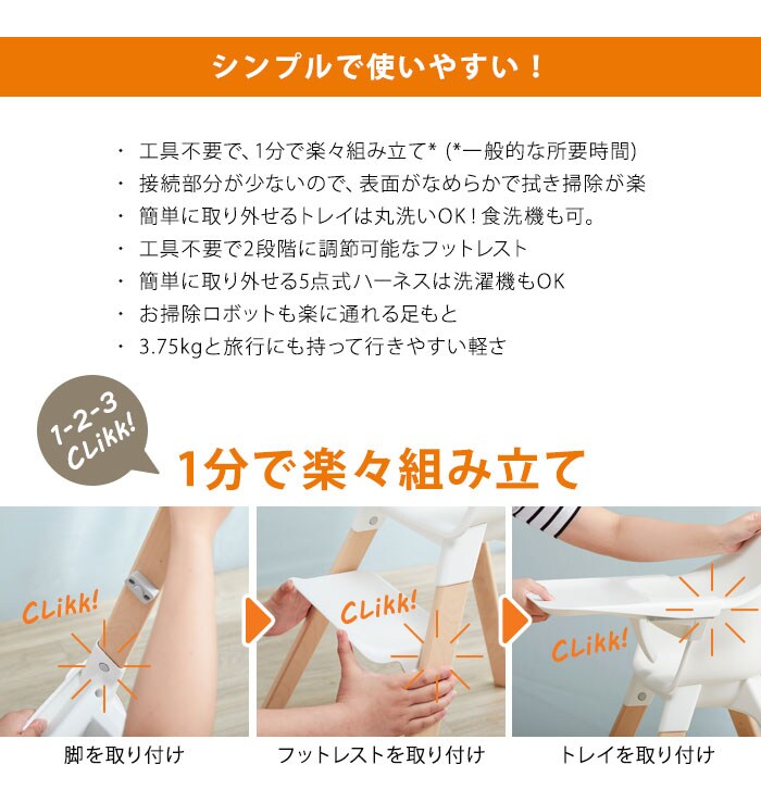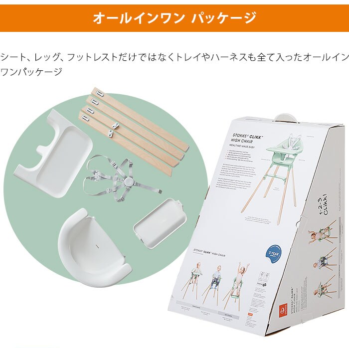 | ストッケ クリック(STOKKE CLIKK) お食事タイムをもっと楽にもっと楽しく シンプルで使いやすい ・工具不要でラクラク組み立て。2つのポジションにアジャスト可能なフットレスト。 ・シンプルな構造で拭き掃除が楽 ・簡単に取り外し可能な5点式ハーネス。洗濯機にて洗濯可能。 オールインワンパッケージ+6ヶ月~3歳までお食事をサポート ・全てのパーツが一つの箱に収納(5点式ハーネス、トレイ、フットレスト、レッグ、シート) ・箱サイズ:58.5×37.5×42.5cm ・トレイ、ハーネスはそれぞれ取り外しが可能。 ・3歳頃(体重15kg)まで、長くお使い頂けます。 |