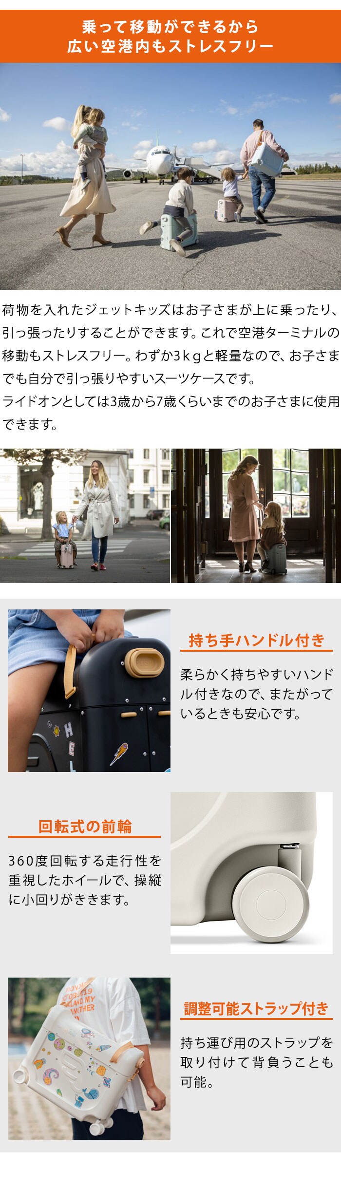 | 1台3役のプレミアムスーツケース 容量は20リットル:子どもの荷物が1つに スーツケースが乗り物に:空港・ゲートまで乗って移動 機内や列車でベッドに:飛行機内・電車車内でレッグレスト及び簡易ベッドに 内容物:ライドボックス(スーツケース)、ストラップ、ステッカー、ベッド用延長スライド、マットレス、取扱説明書(多言語対応)、製品保証書、クルーバックパック |