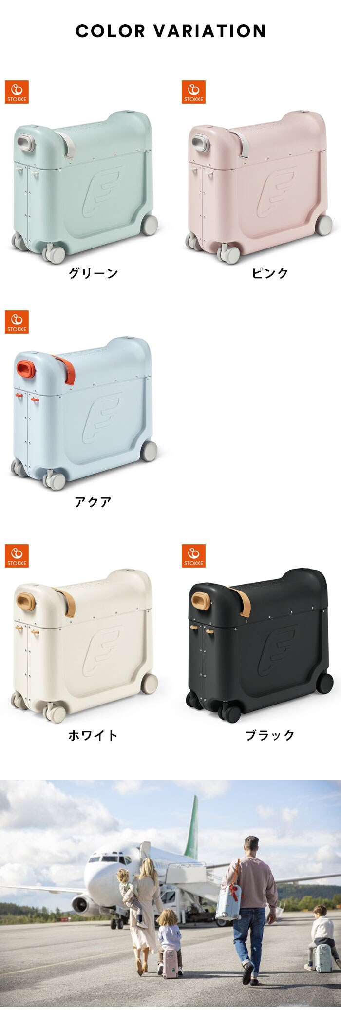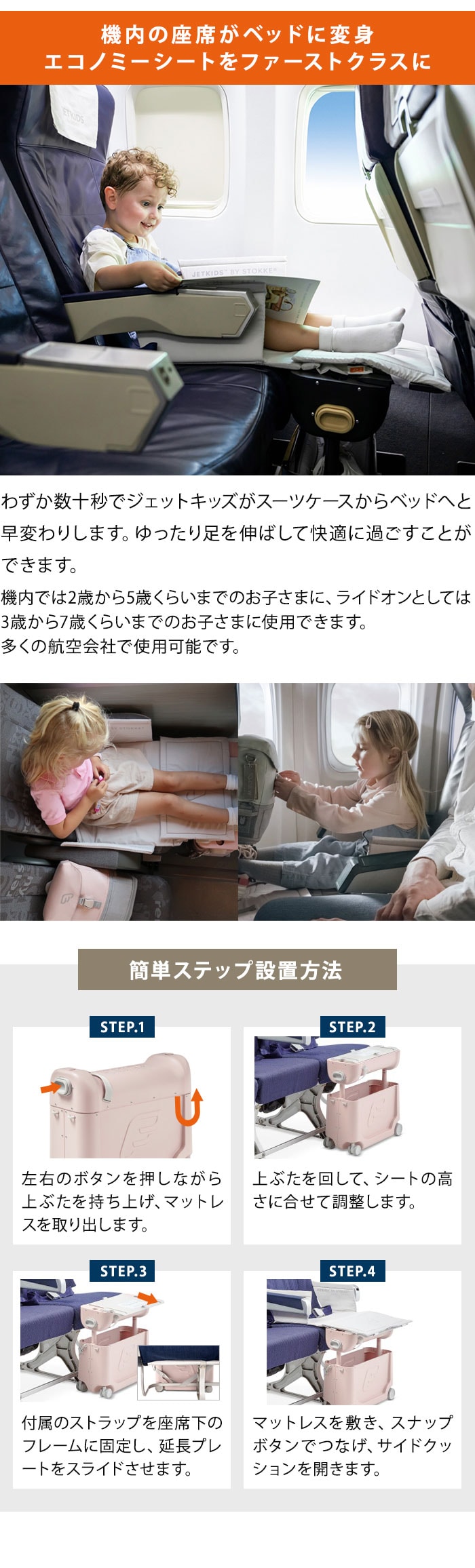 | BedBo×(R)は機内用ベッドやレッグレストの機能を搭載した世界で唯一のプレミアムなお子さま用機内持ち込み可能スーツです。 北欧のデザインに飛行機のテイストを組み合わせた旅の必需アイテム。短時間から長時間のフライト中もお子さまが快適にお休み・睡眠できます。 十分な収納力で楽しさと機能性を兼ね備えたBedBo×(R)がお子さまのアイテムを守ります。荷物を入れたスーツはお子さまが上に乗ったり、引っ張ったりすることができます。これで空港ターミナルの移動もストレスフリー。 機内では、5つの簡単なステップでBedBo×(R)がスーツケースからベッドへと早変わりします。機内では小さな赤ちゃんや1歳から7歳までのお子さまに、ライドオンとしては3歳以上のお子さまに使用できます。 【お出かけ前に】 付属のステッカーでBedBo×(R)をパーソナライズ。 十分な収容力で旅の必需品も安心。 上部のフタから荷物を簡単に取り出せます。 【移動中】 衝撃を吸収する前輪スイベル車輪で移動が楽々。 多目的な調整可能ストラップでBedBo×を背負うことも引っ張ることも可能。 スーツケースの上に乗っている間お子さまが握れるトップハンドル付き。 疲れた脚を休めるフットレッジ付き。 【機内で】 飛行機、電車、フェリーで使用可能。 ユニバーサルデザインで標準的なエコノミーシートにフィット。 フタとエクステンションプレートがシートの長さを伸ばし、表面積を増やします。 マットレスとサイドパネルがシート上で快適な空間をつくります。 お休み中でもお座り中でも使用できるシートベルト付き。 【JETKIDS BEDBO×】開発の背景 開発者のクリスティーナとハルヴォーは二人の子を持つノルウェー人夫婦。旅行が趣味である二人は子どもが疲れていても旅行中寝れないことに困っていました。どうにか寝かしつけても機内では両親の膝枕などが必要で、ふたりとも疲れ切ってしまいます。 自分たちの友人夫婦からも同じ悩みを聞いた二人は、子どもを寝かしつけられ、しかも荷物の多い子供連れ旅行に便利なスーツケース・ライドオン機能を併せ持った1台3役のスーツケースを思いついたのです。 航空エンジニアでもある春ヴォート旅行業界の経験を持つクリスティーナは親としての経験も活かして、ノルウェーのデザイン会社と協力し、今のBedBo×が生み出されました。 |