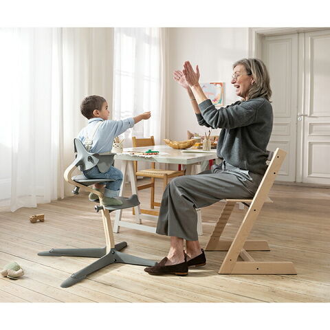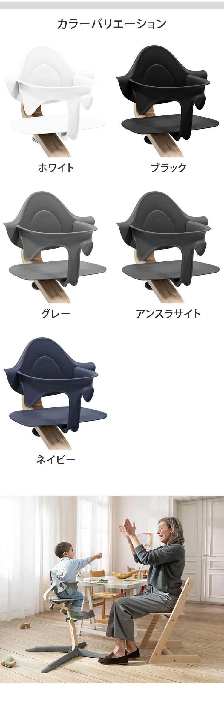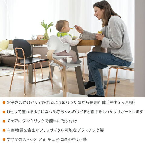 | 「1972年、北欧の著名デザイナー、ピーター・オプスヴィックが、息子トールのためにデザインしたトリップトラップチェアは、家族で囲む楽しい食卓のために生まれました。その後、孫娘のアイリスのために誕生したのが、アクティブ・シッティングを提唱するノミ チェアです。どちらのチェアも、子どもたちが自由な姿勢で座れるようサポートし、人間工学に基づいた正しい姿勢を見出すよう、自分から積極的に座ることを促します。この”ノミ”の名前は「Ergonomics エルゴノミック(人間工学)」に由来します。」 ストッケ ノミ チェアは、生まれた時から生涯使い続けることができるイスです。調整に工具が要らないシームレスな設計と、人間工学に基づいたデザインが年齢を問わず快適な座り心地を演出します。 ノミ チェアは、お子さまが座りながらも自由に動くことができるよう、さまざまな座る姿勢をサポートします。このアクティブ・シッティング(自由に座る)という考え方は、お子さま自身が本能的に座りやすいと感じる理想のポジションを見つけられるよう、自然な動きを促すものです。 ストッケ ノミのコレクションは、さまざまな色と木材のコンビネーションで、ニューボーンセット、ベビーセット、トレイ、クッション、ハーネス、ニューボーンセット用プレイバー等のアクセサリーを展開。 子どもの自由な動きをサポートするイス ・腰座りしたお子さまからお使いいただけます(6ヶ月頃~3歳頃まで※耐荷重 15kg) ・サイドと背中をしっかりサポート ・チェアに簡単に装着できます。 |