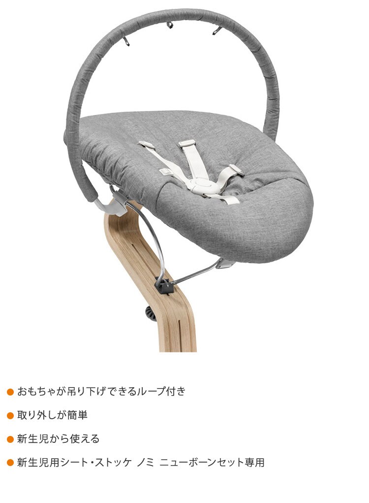 | 「1972年、北欧の著名デザイナー、ピーター・オプスヴィックが、息子トールのためにデザインしたトリップトラップチェアは、家族で囲む楽しい食卓のために生まれました。その後、孫娘のアイリスのために誕生したのが、アクティブ・シッティングを提唱するノミ チェアです。どちらのチェアも、子どもたちが自由な姿勢で座れるようサポートし、人間工学に基づいた正しい姿勢を見出すよう、自分から積極的に座ることを促します。この”ノミ”の名前は「Ergonomics エルゴノミック(人間工学)」に由来します。」 ストッケ ノミ チェアは、生まれた時から生涯使い続けることができるイスです。調整に工具が要らないシームレスな設計と、人間工学に基づいたデザインが年齢を問わず快適な座り心地を演出します。 ノミ チェアは、お子さまが座りながらも自由に動くことができるよう、さまざまな座る姿勢をサポートします。このアクティブ・シッティング(自由に座る)という考え方は、お子さま自身が本能的に座りやすいと感じる理想のポジションを見つけられるよう、自然な動きを促すものです。 ストッケ ノミのコレクションは、さまざまな色と木材のコンビネーションで、ニューボーンセット、ベビーセット、トレイ、クッション、ハーネス、ニューボーンセット用プレイバー等のアクセサリーを展開。 子どもの自由な動きをサポートするイス ・トイハンガー※ニューボーンセットと一緒にご使用ください。 |