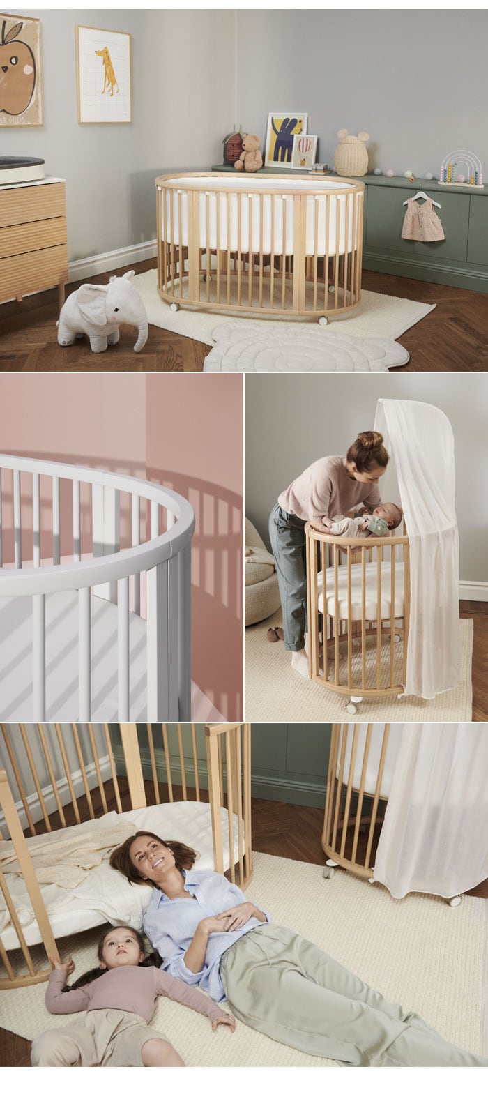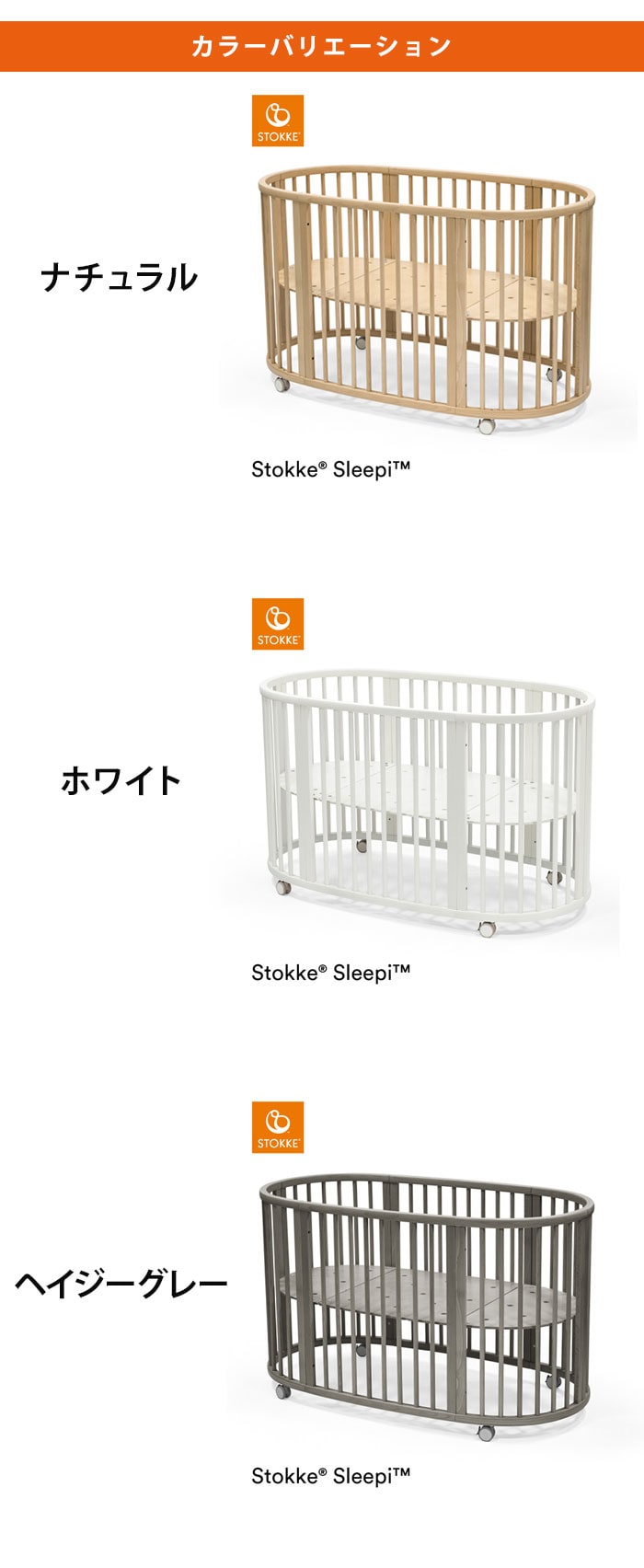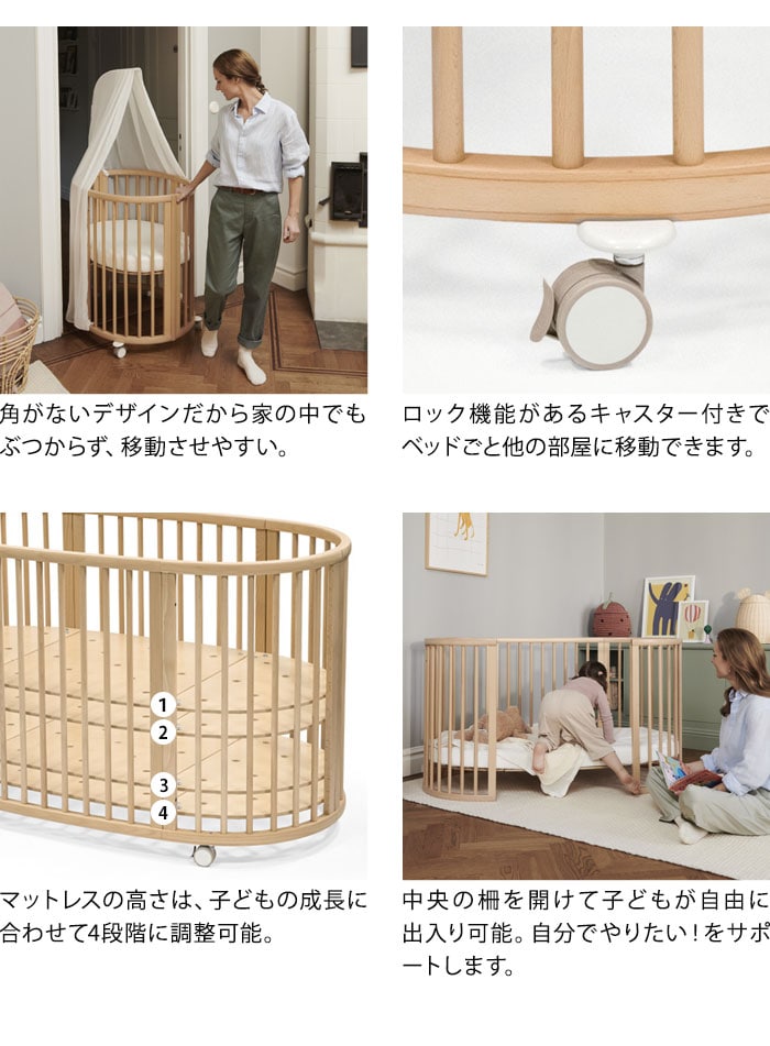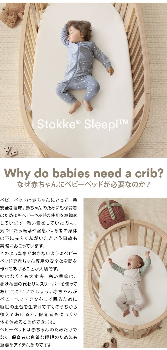 | 【20年以上愛され続けるベビーベッド】 日々の幸せなひと時は、赤ちゃんがまぁるくなって、すやすや眠っている寝顔を眺めること、と思うママパパは多いはず。 赤ちゃんがうとうとしながらあなたの手を握っていたりするのを見ていると、自分が眠いのも忘れて幸せな気分になっていませんか。 ストッケ スリーピーは1999年の発売から20年以上が経ちました。ベッドに柵がついた四角いベッドしかなかった時代に、親子の絆を深める特別なベッドを作りたい、という思いから生まれたスリーピーは時代を超え、今なお世界中の家族に愛され続けるアイコニックな製品となりました。 【スリーピー開発秘話】 成長が早く、どんどんニーズが変わる子ども用の製品を開発するのは、とてつもない挑戦です。赤ちゃんの成長速度ゆえに、ママパパは短期間しか使えないものを購入しなければなりません。 スリーピーベッドは、ストッケ製品の開発コンセプト「親子の絆を深めるデザイン」に基づき、高さ調節可能で、部屋から部屋への移動が簡単なキャスター付きで、子どもの成長に合わせて大きくなるベッドとして開発しました。 丸いベッドの形は、赤ちゃんが生まれてくるまでの間に安心感を感じていた、ママのおなかの中を再現したものです。とがった角がないやさしい丸みを帯びたベッドは、赤ちゃんに快適な眠りの空間を提供するよう、設計しました。 開発チーム:スザンヌ グロンラウンド 安全基準:PSCマーク取得済み |