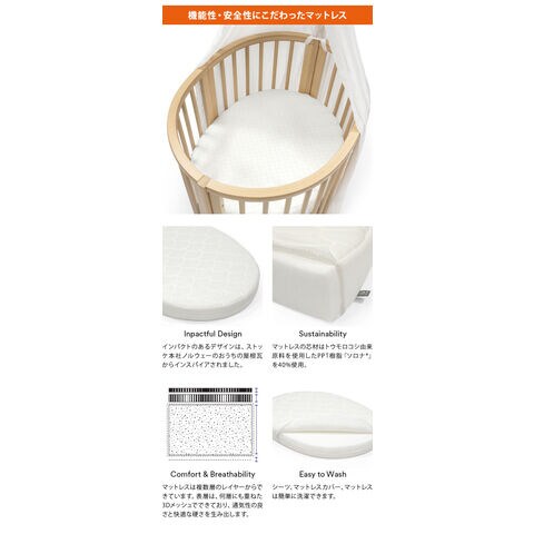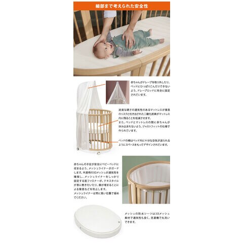丸いベッドの形は、赤ちゃんが生まれてくるまでの間に安心感を感じていた、ママのおなかの中を再現したものです。とがった角がないやさしい丸みを帯びたベッドは、赤ちゃんに快適な眠りの空間を提供するよう、設計しました。