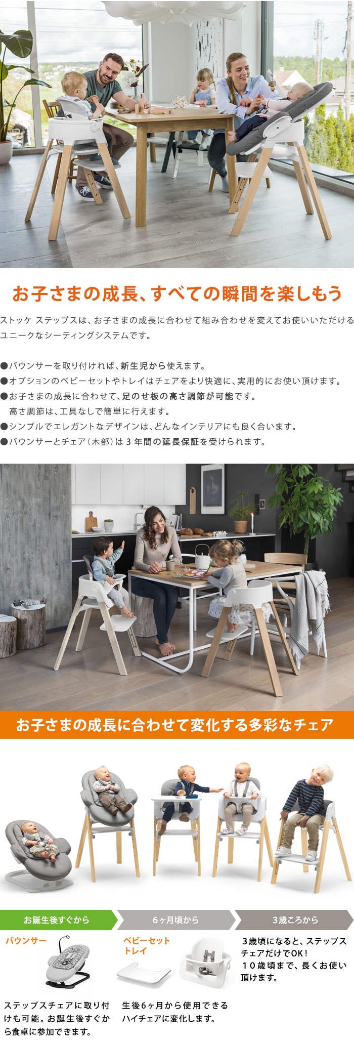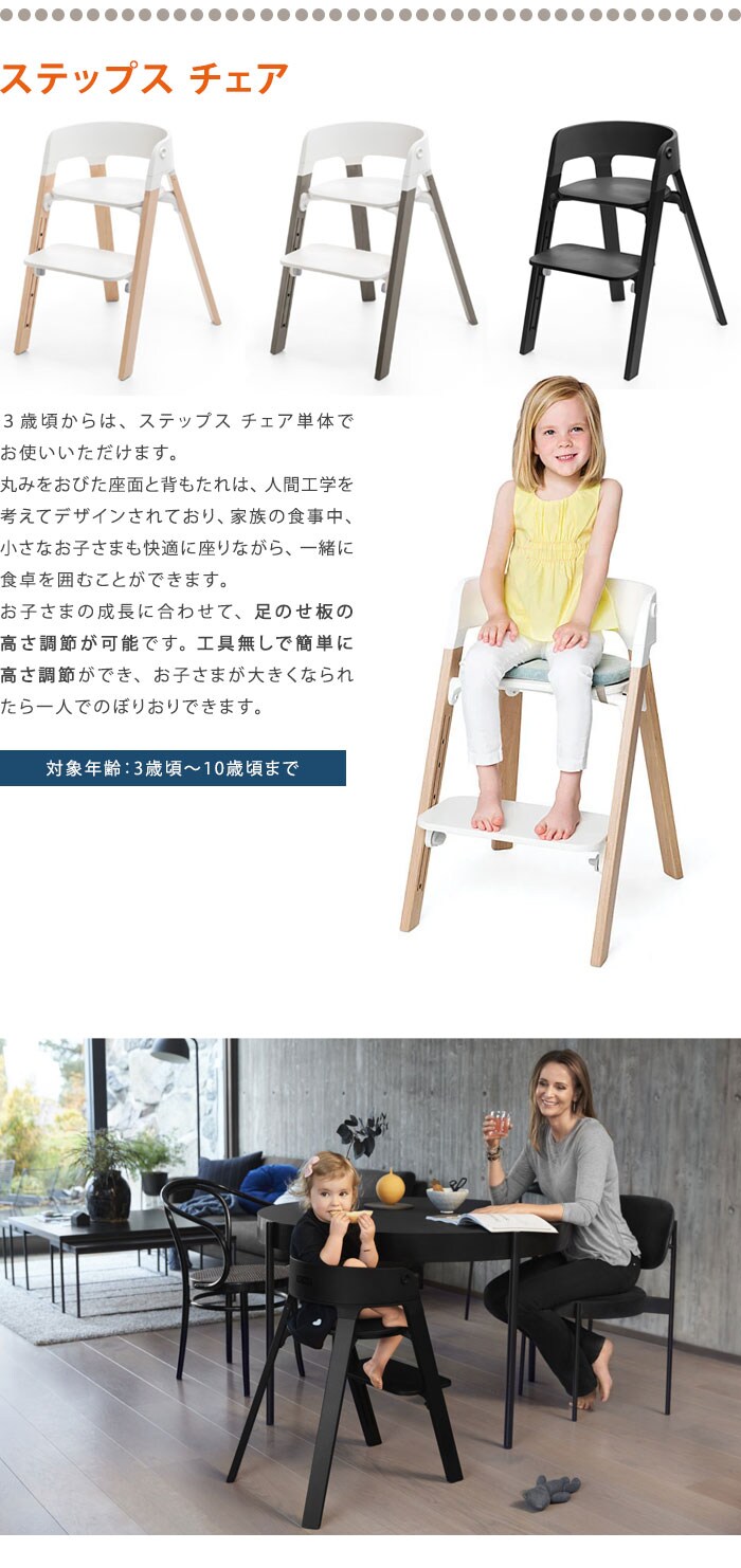 | お子さまの成長に合わせて、足のせ板の高さ調節が可能です。 高さ調節は、工具なしで簡単に行えます。 ステップス チェアは、10歳頃まで使えます。 延長保証登録で、安心の3年保証。 お子さまの成長に合わせて変化する多彩なチェア。 |