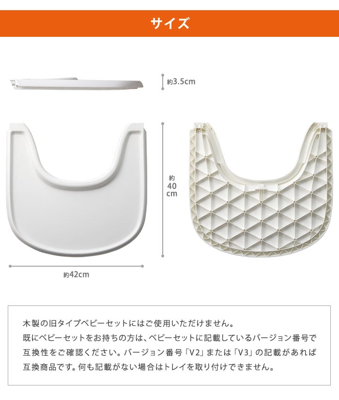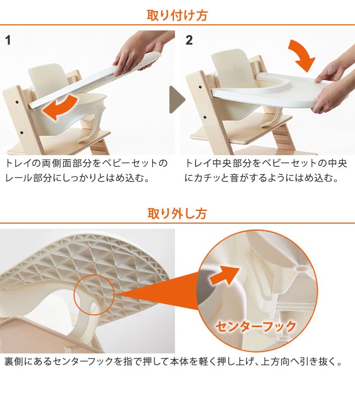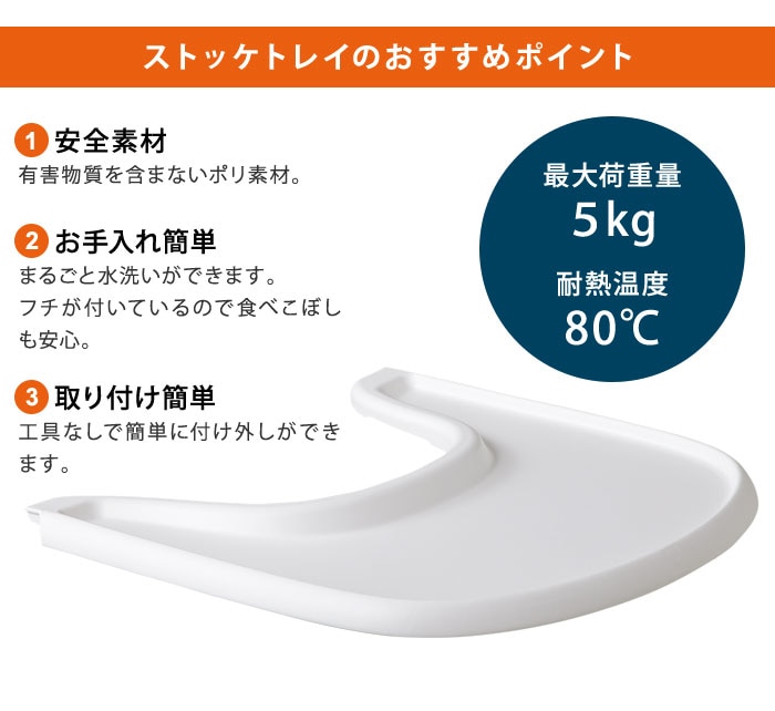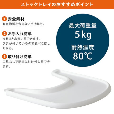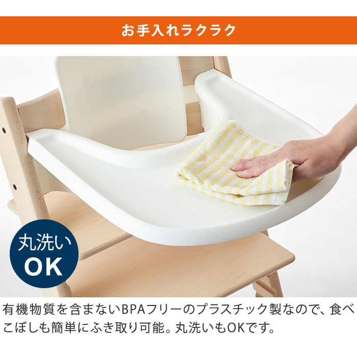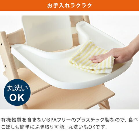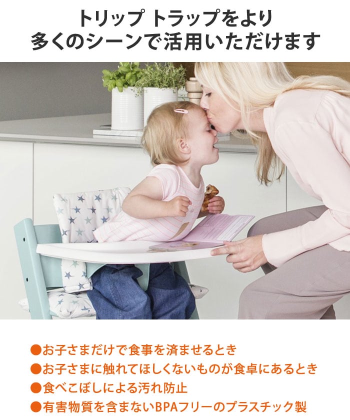 | 赤ちゃんの食事のお世話がしやすくなります お食事のお世話をするときに、親子が向き合える快適なテーブルスペースになります。 赤ちゃんが危険な物に簡単に触れるリスクを軽減します トレイを付けることによって、赤ちゃんがダイニングテーブルに置いてある鋭利な物や飲み込む危険性があるものなどに手が届きにくくなります。 こぼしたり壊したりをふせげます 赤ちゃんはよく床に物を落とします。ダイニングテーブルにあるものに手が届きにくくなるので、お皿やグラスなどをひっくりかえしたり、落としたりする心配もありません。 食卓以外の場所でも、赤ちゃんが食事をしたり遊んだりする快適な場所になります。 食卓を囲む以外でも、例えば、キッチンで食事の準備をしたり、洗い物をしている時など、赤ちゃんとそばにいることができ、トレイを取り付けることで赤ちゃんの快適な食事や遊びのスペースになります。 お手入れ簡単 リサイクルPPGF使用 有害な材質は使用しておりません。 |