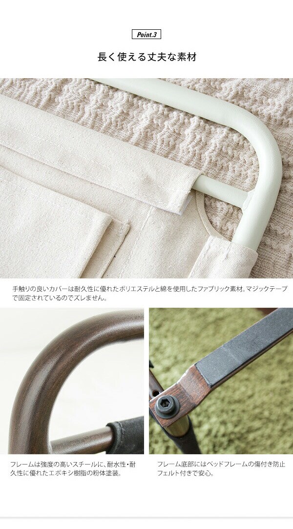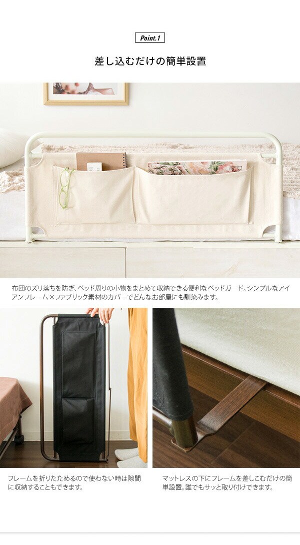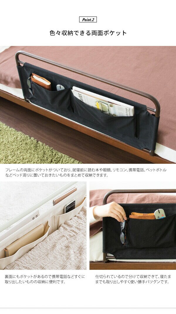 マットレスの下に差しこむだけの簡単取り付けで、布団のズレ落ちを防止します。布製ポケットが両面に付いており、携帯電話やリモコンなどの小物を収納ができます。