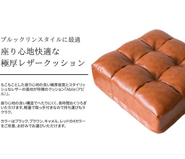 もこもことした座り心地の良い極厚座面とスタイリッシュなレザーの張地が特徴のクッション『Abile(アビル)』。