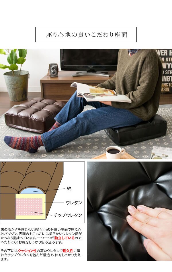 座り心地の良い構造でへたりにくく、長時間おくつろぎいただけます。軽量で取っ手付きなので持ち運びもラクラク。