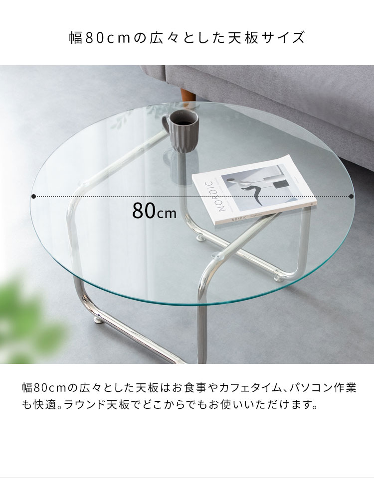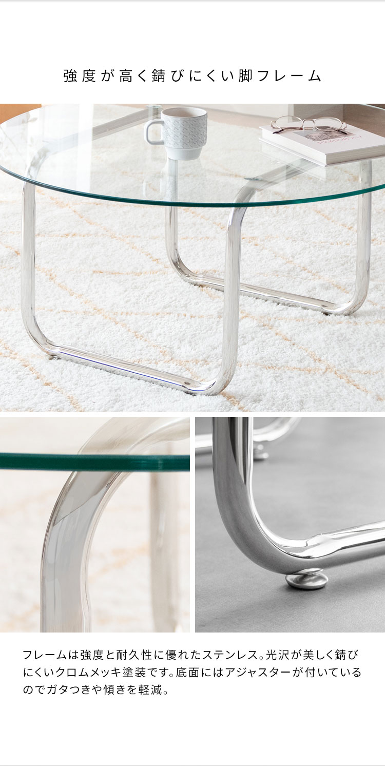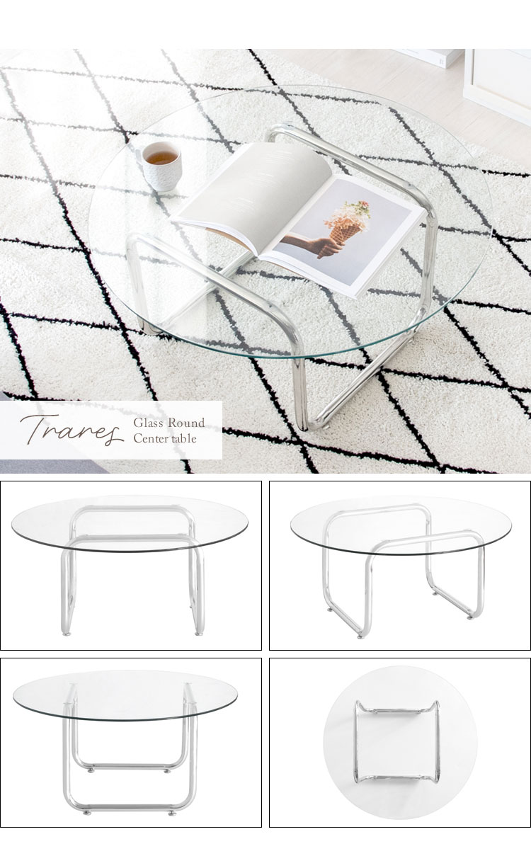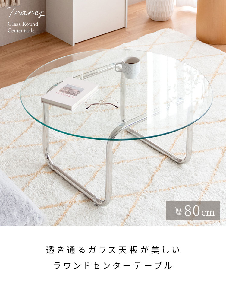 テーブル 机 ガラステーブル ラウンドテーブル ローテーブル 丸 強化ガラス ステンレス脚 アジャスター trares 作業 韓国 おしゃれ 幅80cm 奥行80cm 高さ38.5cm 透明 クリア シルバーフレーム【送料無料】