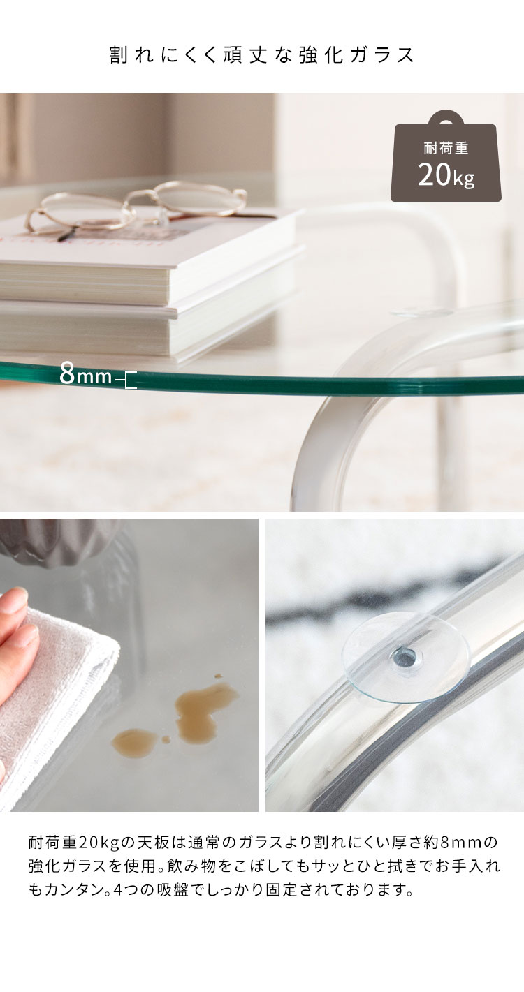 丈夫な強化ガラスの天板は広々とした幅80cmで作業やカフェタイムも快適。