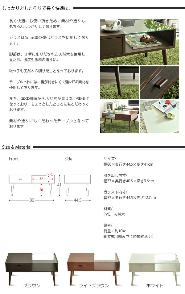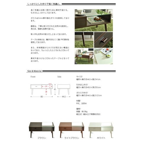 | サイズ | 幅80×奥行き44.5×高さ41cm 引き出し内寸:幅33×奥行き40.5×深さ9.5cm ガラス下内寸:幅37×奥行き44.5×高さ12.7cm |