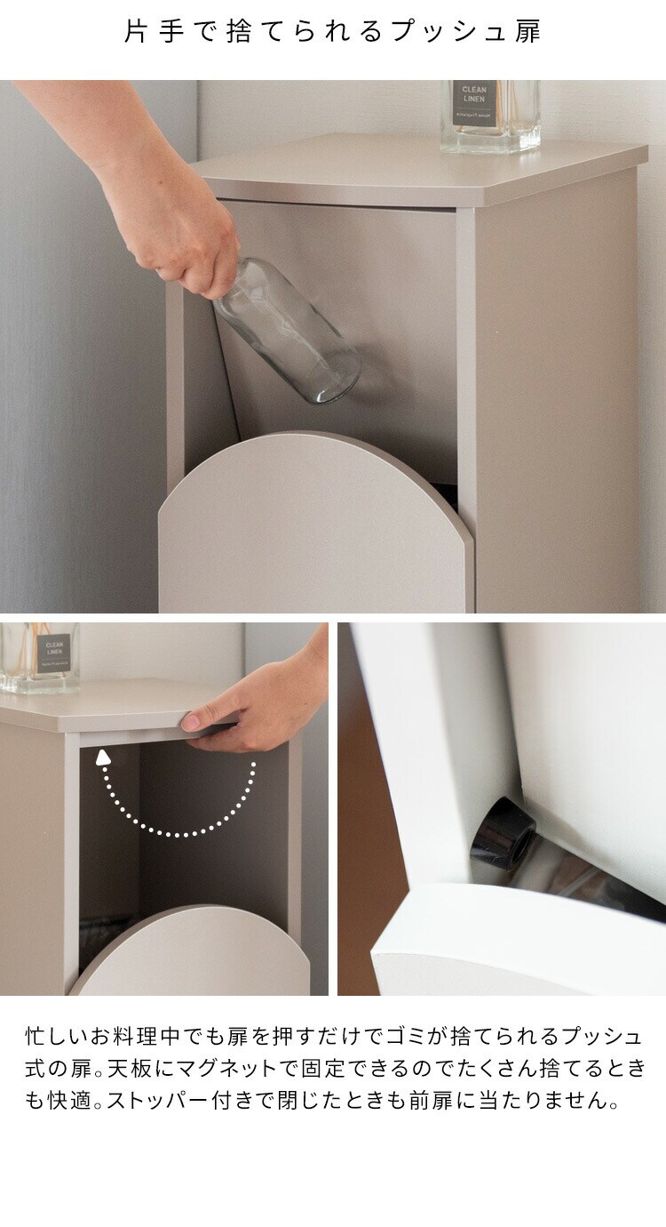 キッチンでお料理中でもゴミが捨てやすいプッシュ扉や、ゴミ袋の付け替えがしやすいリング式で使い勝手もバツグン。
