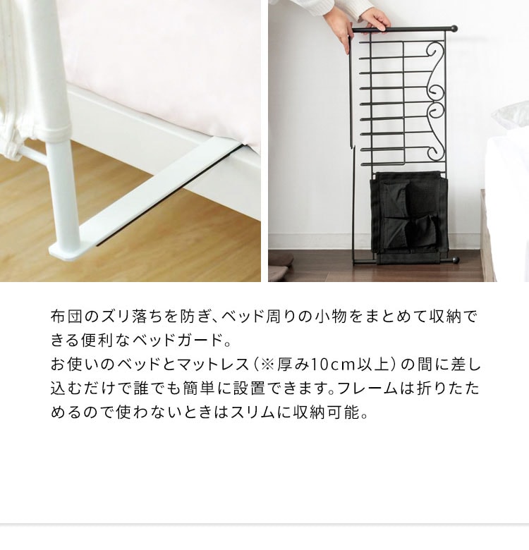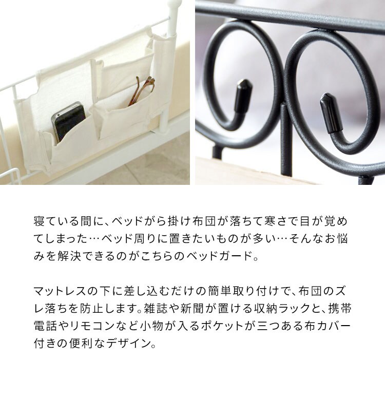 寝ている間に、ベッドから掛け布団が落ちて寒さで目が覚めてしまった…ベッド周りに置きたいものが多い…そんなお悩みを解決できるのがこちらのベッドガード。