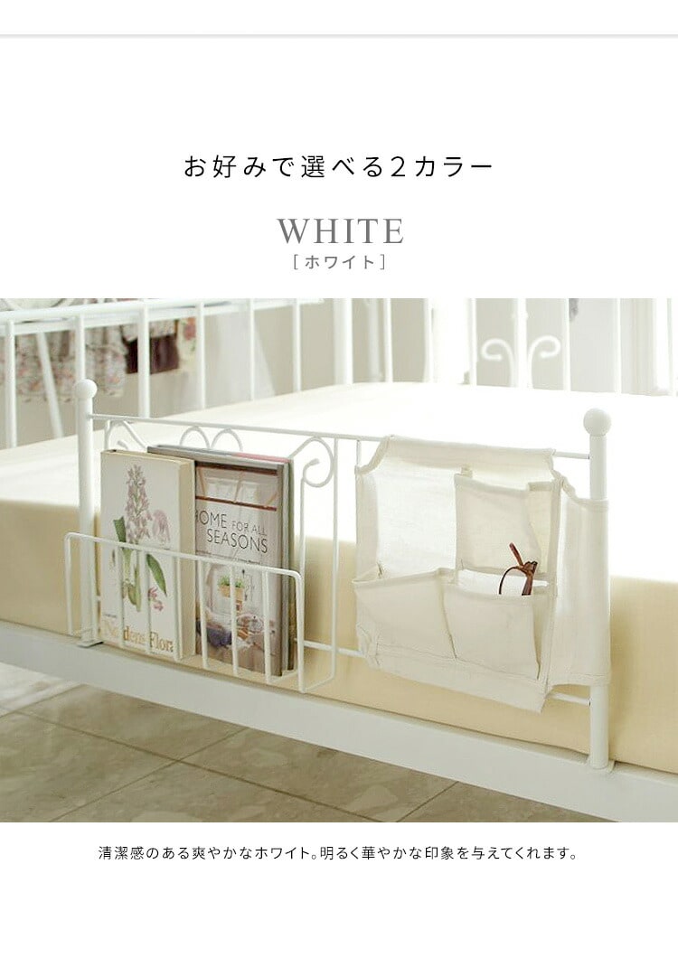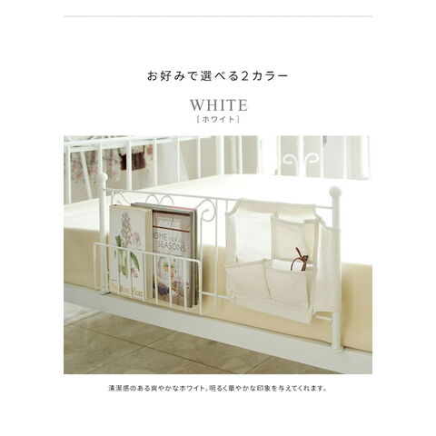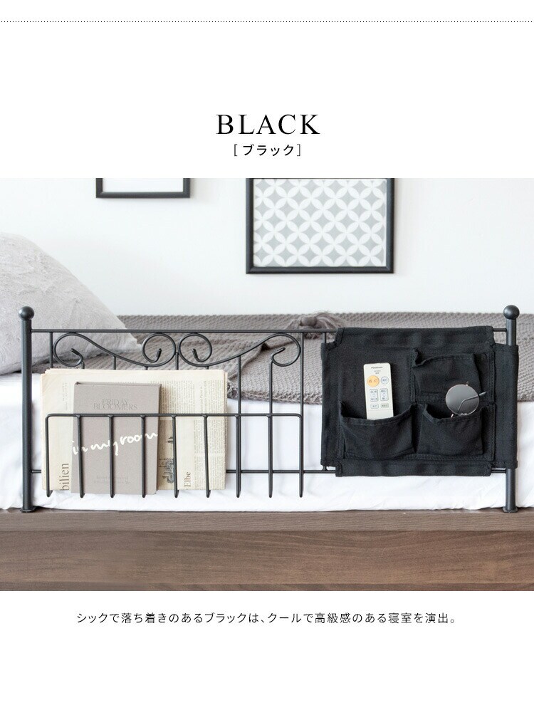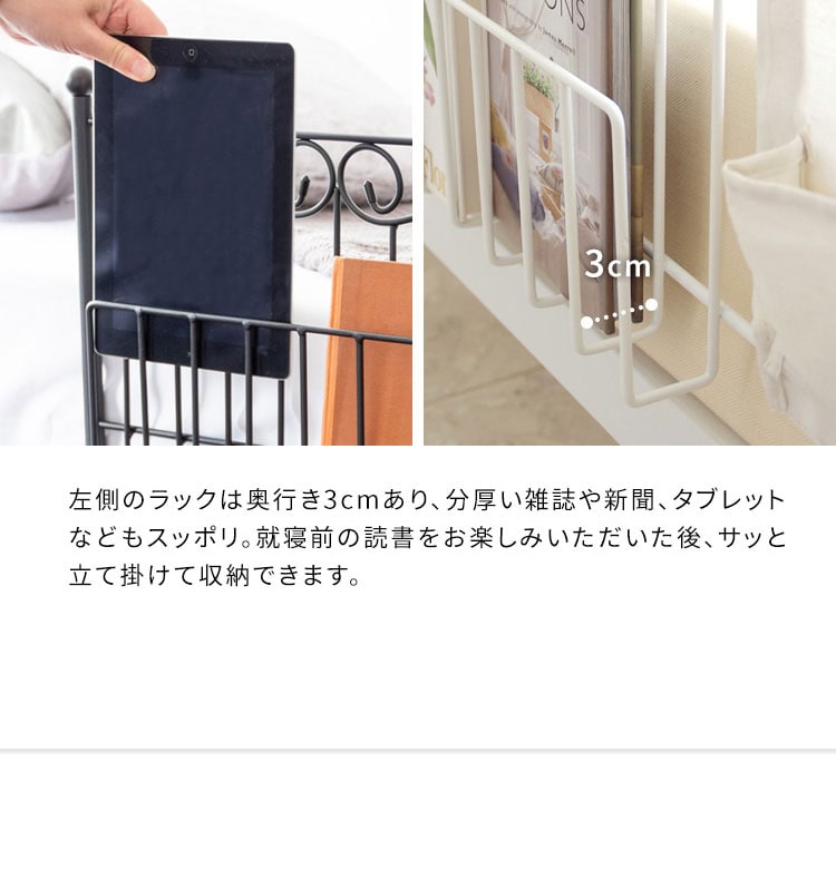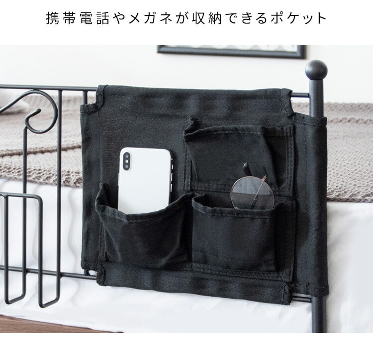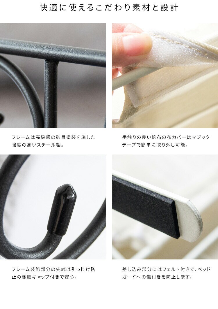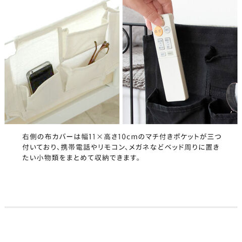 マットレスの下に差し込むだけの簡単取り付けで、布団のズレ落ちを防止します。雑誌や新聞が置ける収納ラックと、携帯電話やリモコンなど小物が入るポケットが三つある布カバー付きの便利なデザイン。