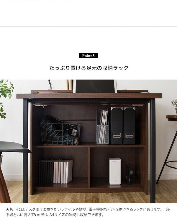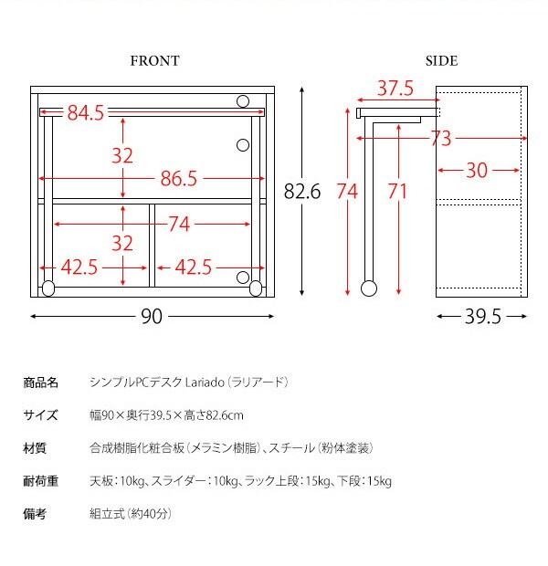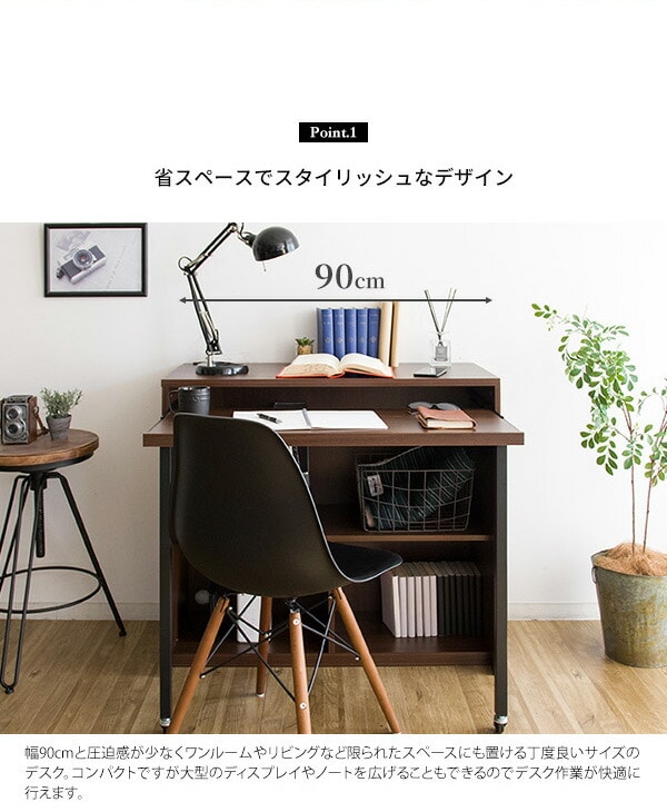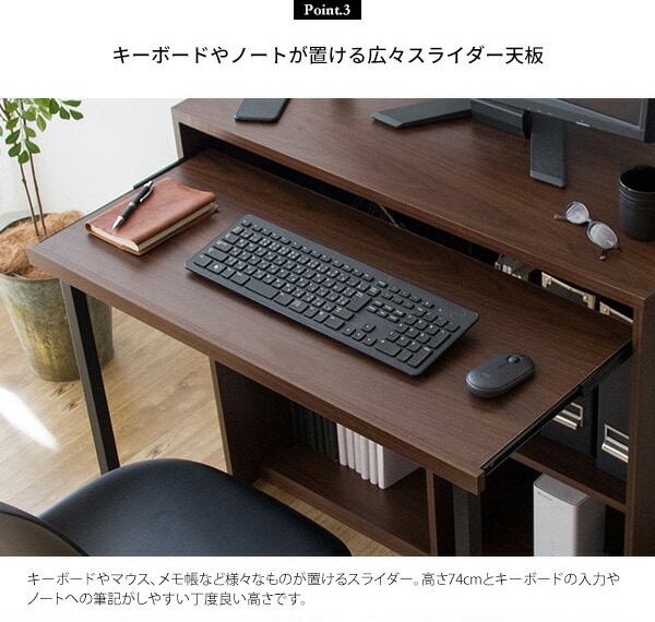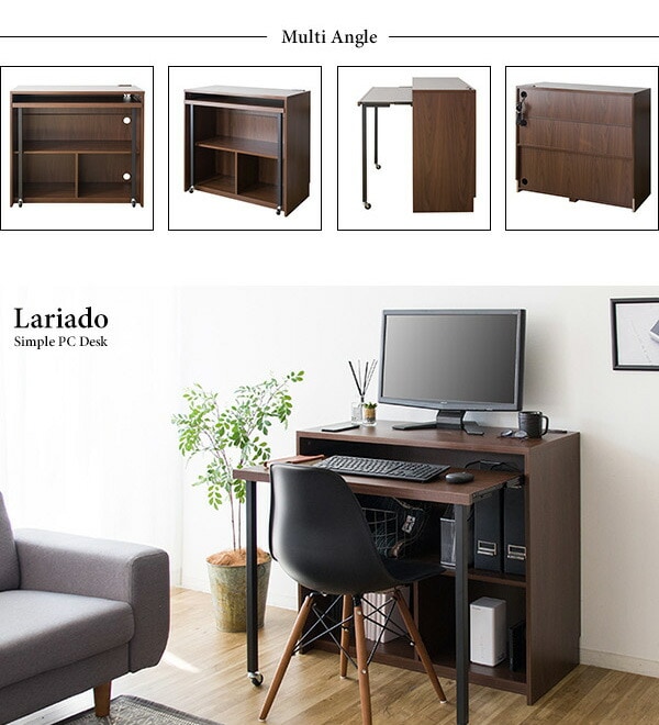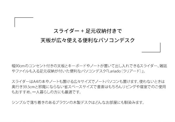 幅90cmのコンセント付きの天板とキーボードやノートが置いて出し入れできるスライダー、雑誌やファイルも入る足元収納が付いた便利なパソコンデスク『Lariado(ラリアード)』。