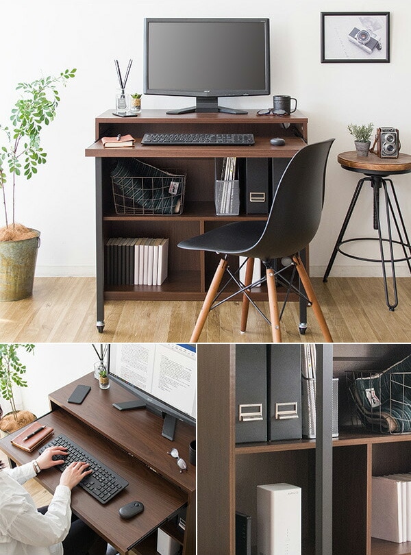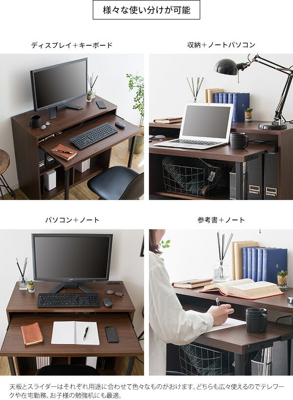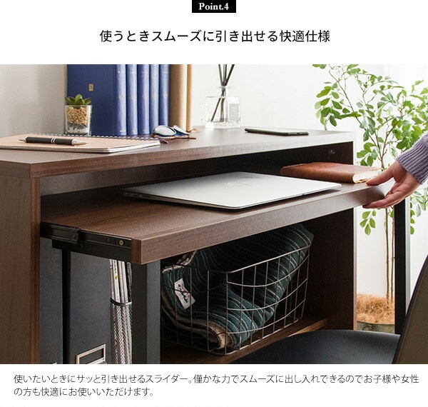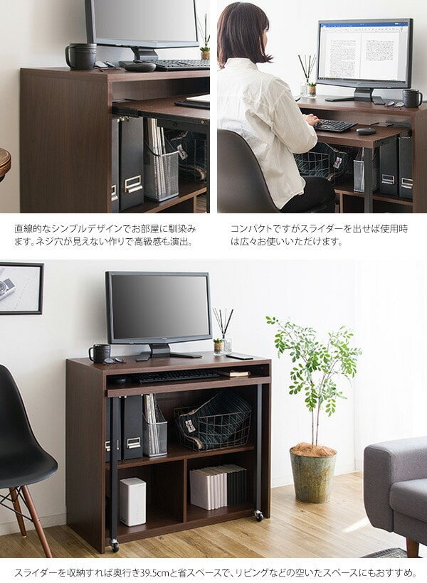 スライダーはA4の本やノートも置ける広々サイズでノートパソコンも置けます。使わないときは奥行き39.5cmと邪魔にならない省スペースサイズで書斎はもちろんリビングや寝室でのご使用もおすすめ。一人暮らしの方にもオススメです。