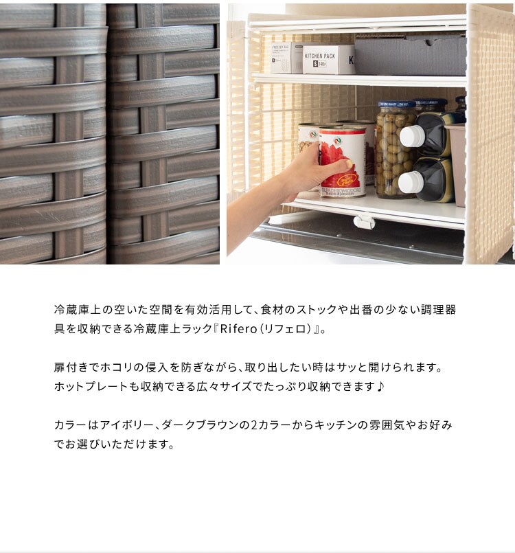冷蔵庫上の空いた空間を有効活用して、食材のストックや出番の少ない調理器具を収納できる冷蔵庫上ラック『Rifero(リフェロ)』。