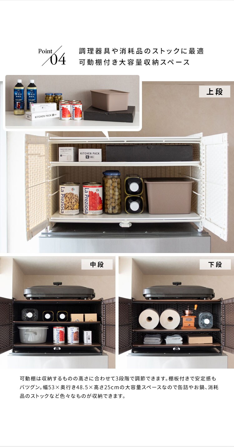 扉付きでホコリの侵入を防ぎながら、取り出したい時はサッと開けられます。ホットプレートも収納できる広々サイズでたっぷり収納できます♪