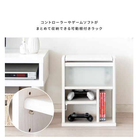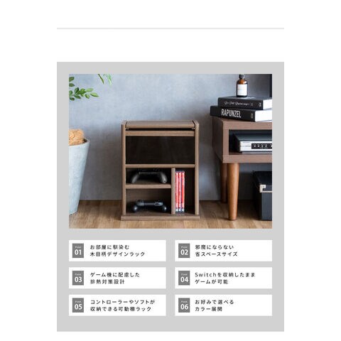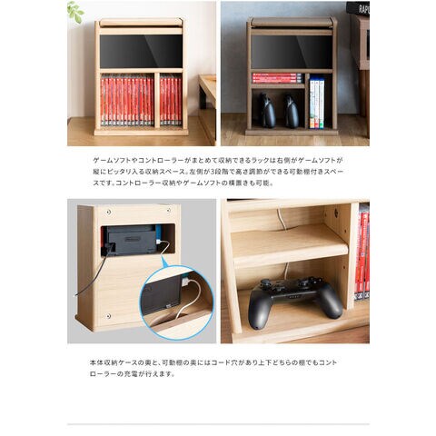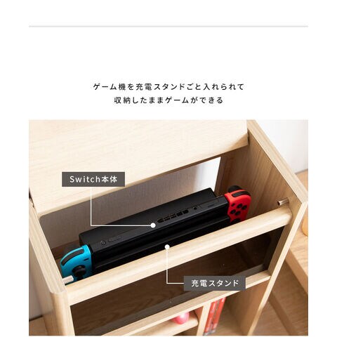 背面は放熱対策もできるオープン仕様。ゲームソフトやコントローラーが入る収納棚付きでSwitch周りをスッキリ。