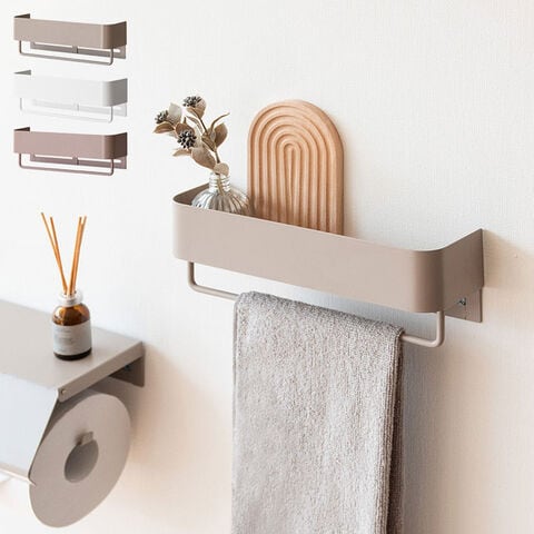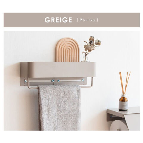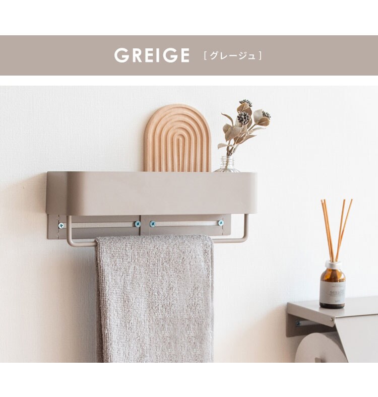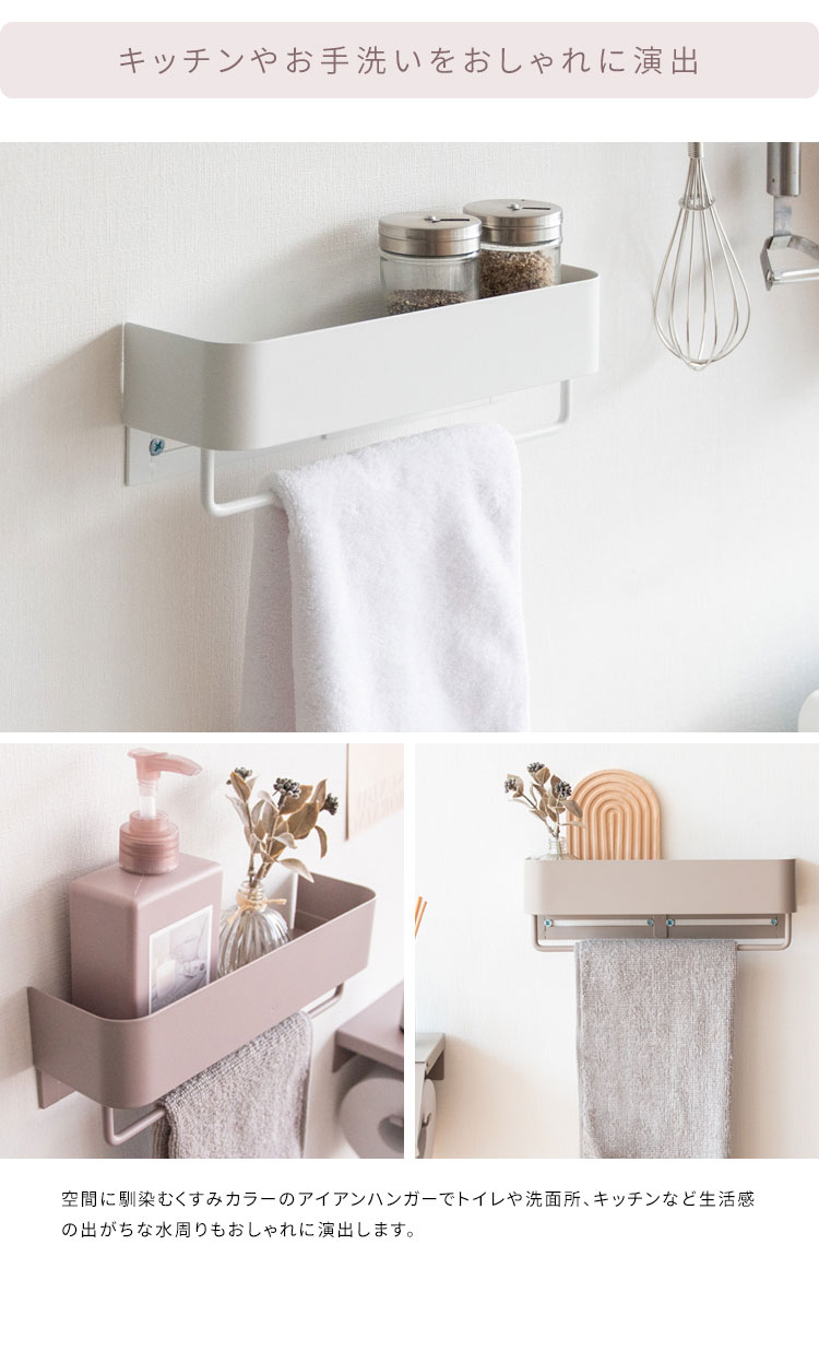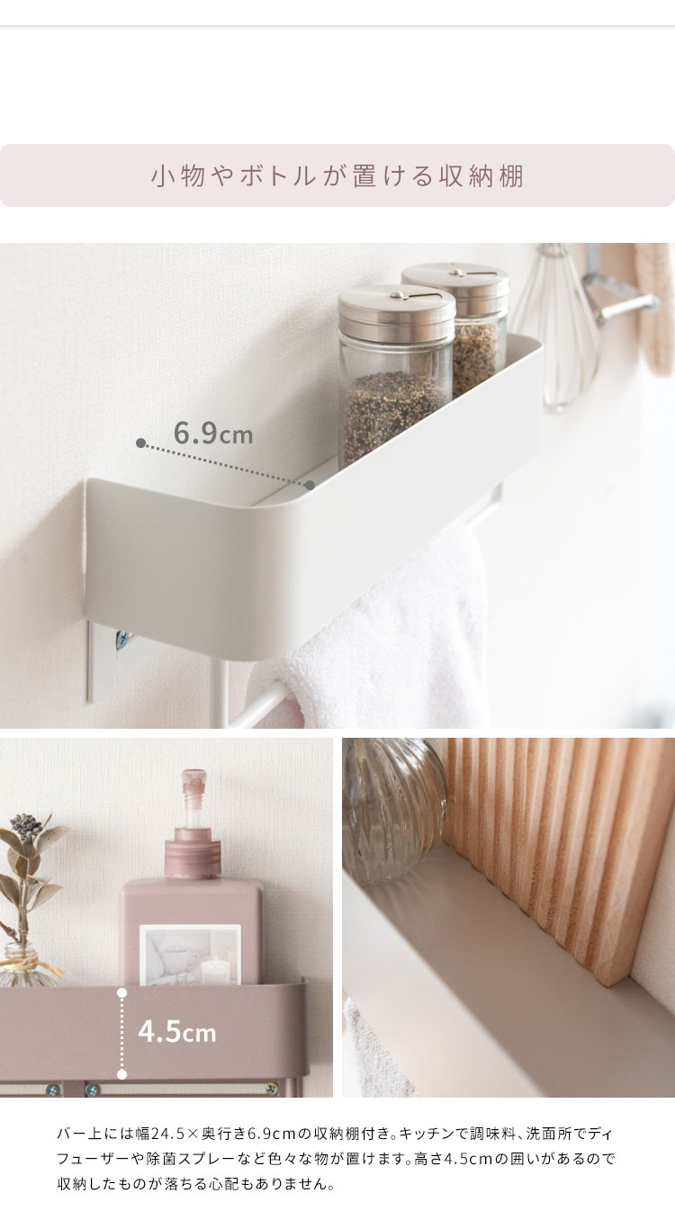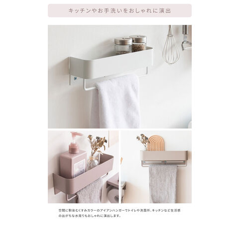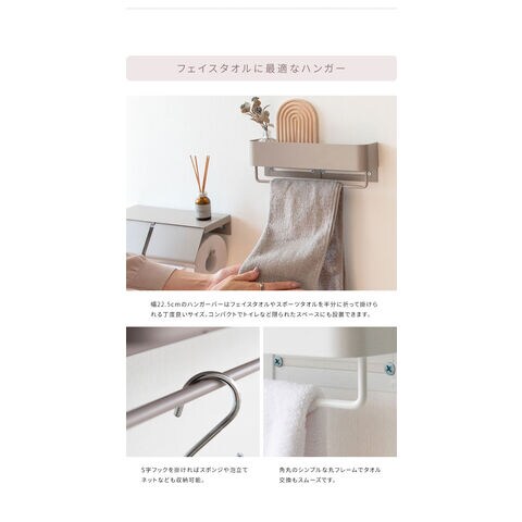 フェイスタオルを半分に折って掛けるのに丁度良いコンパクトサイズのタオルハンガー。ハンガー上にはディフューザーやボトルなどを収納できる便利な棚付き。囲いがあり倒れる心配のないデザインです。