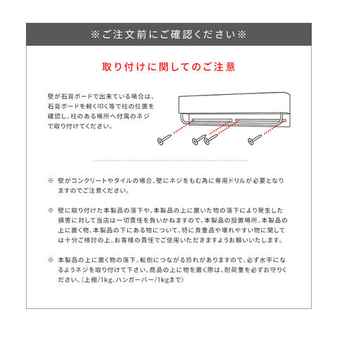耐荷重:ハンガーバー:1kg、上棚:1kg
