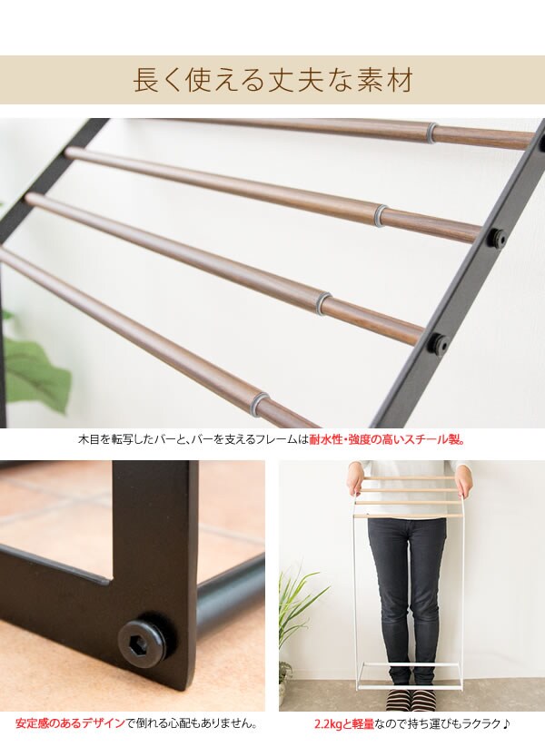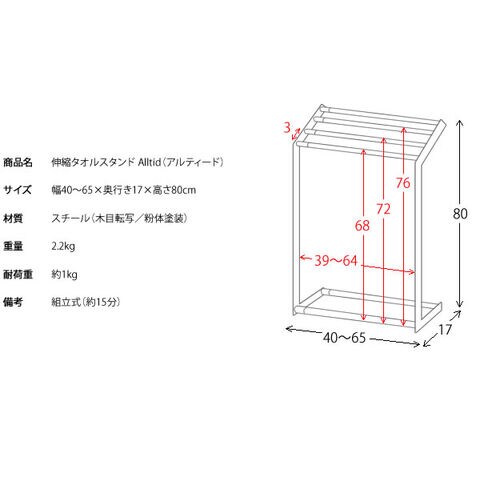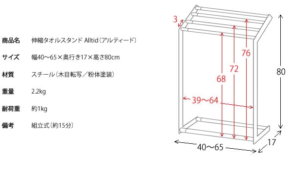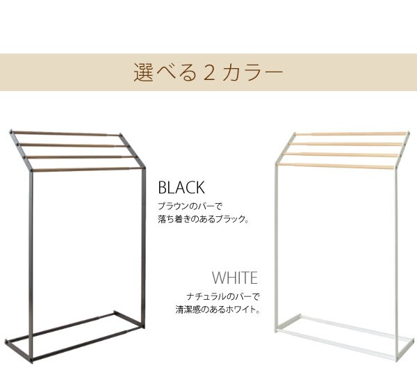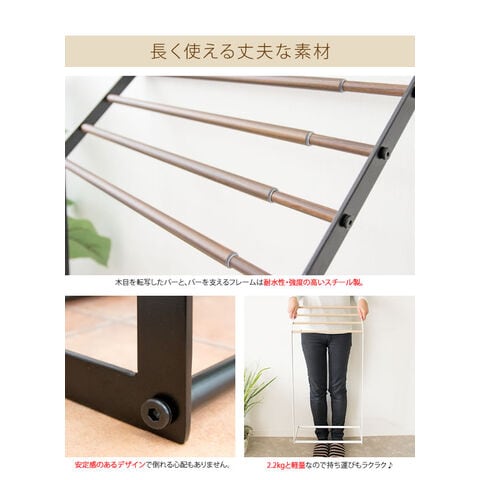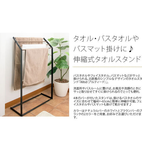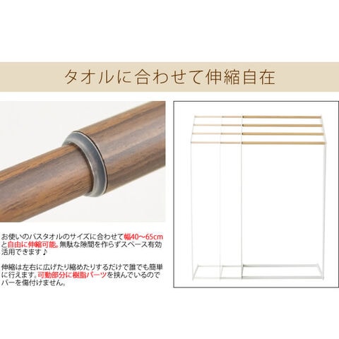 4本のバーが付いたスタンドは、掛けるバスタオルのサイズに合わせて幅40~65cmと簡単に伸縮が可能。フェイスタオルやバスマットも掛けて乾かせます♪