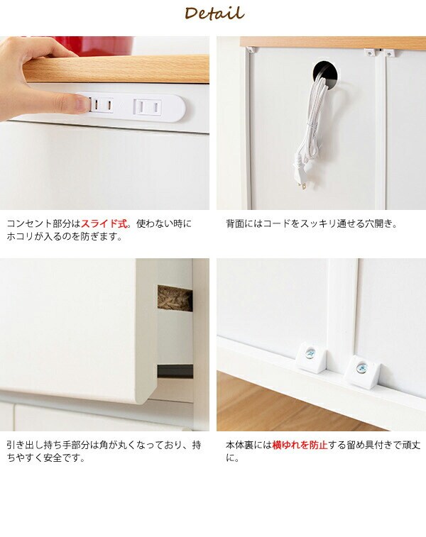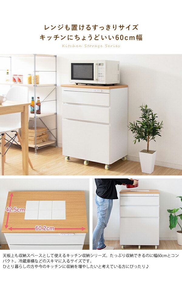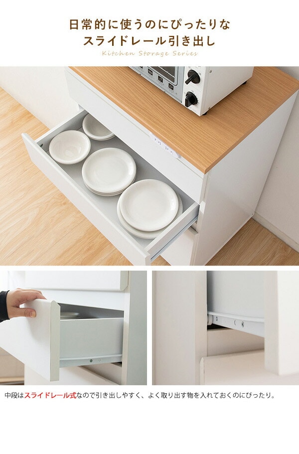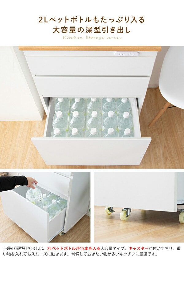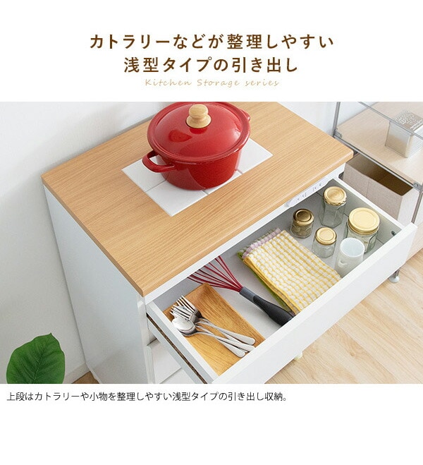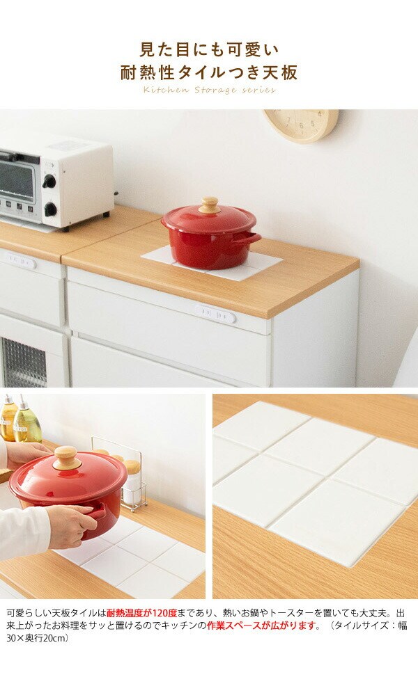天板上にはタイルが敷かれており、熱いお鍋やトースターを置くことができとても便利。2段の整理しやすい浅型引き出しと、2Lペットボトルも入る深型引き出しにたっぷり収納できます。