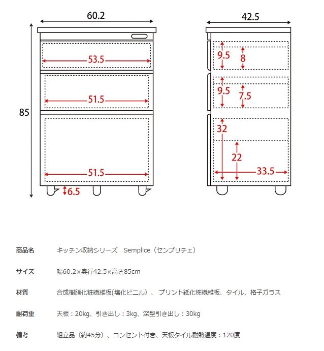天板:20kg、引き出し:3kg、深型引き出し:30kg