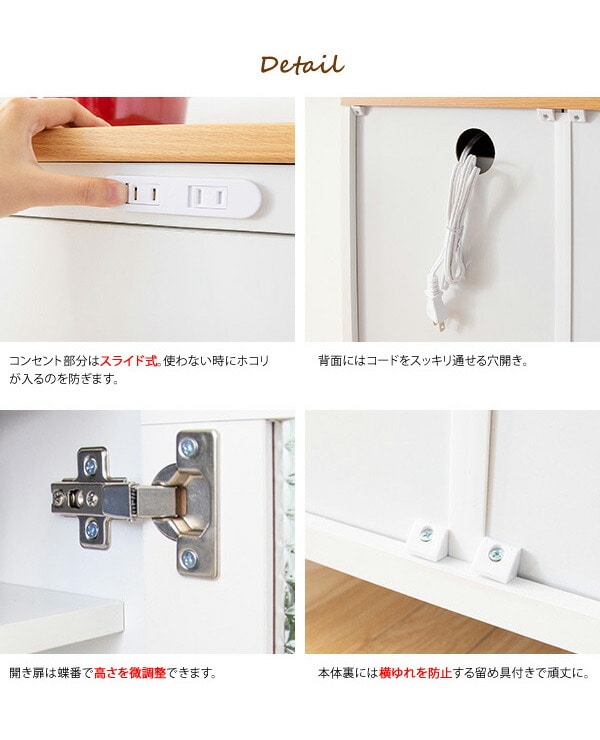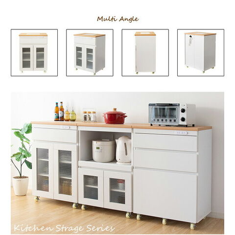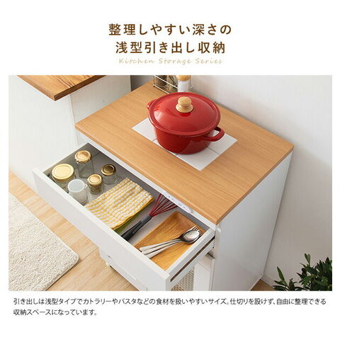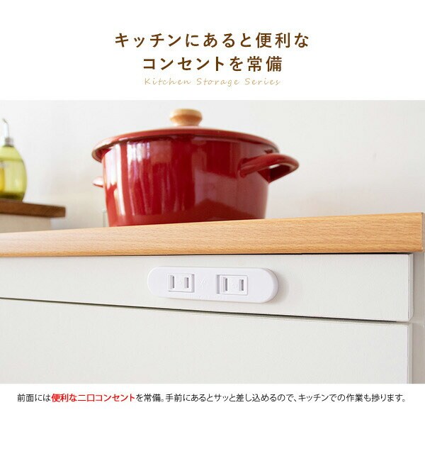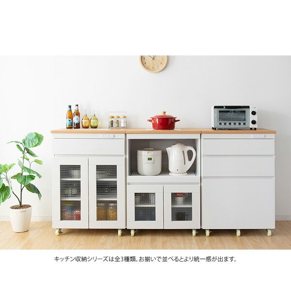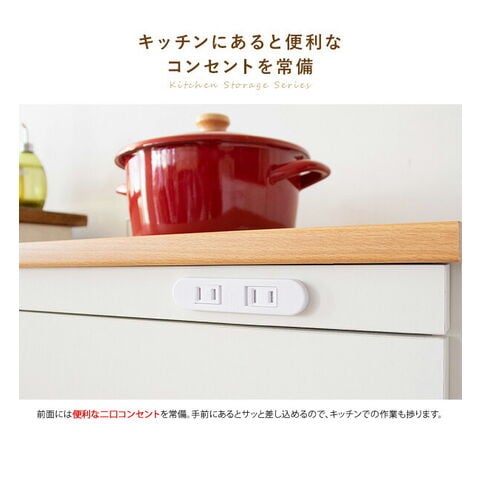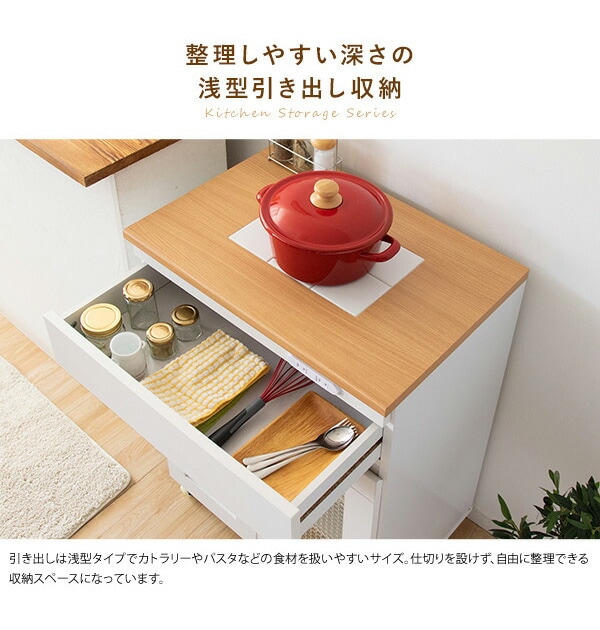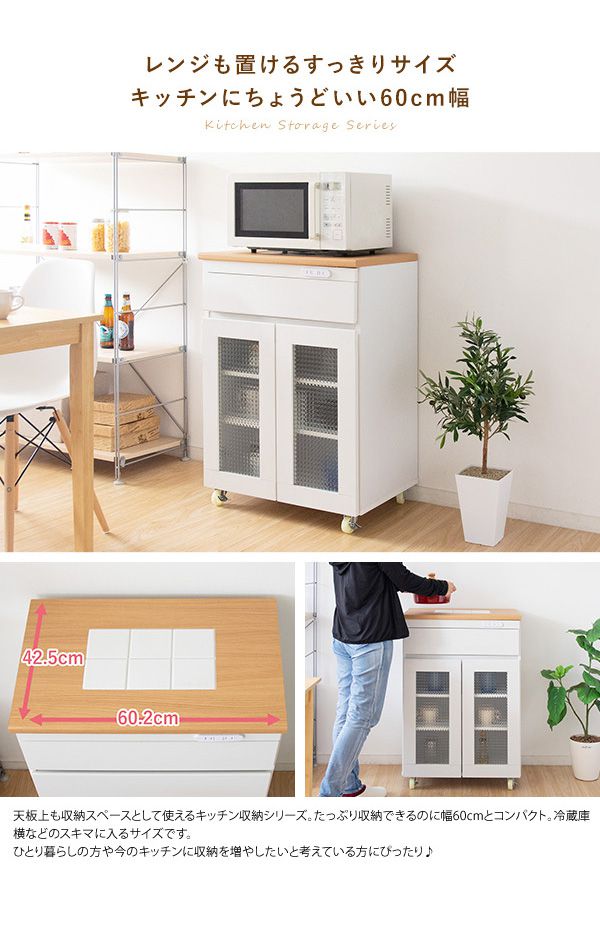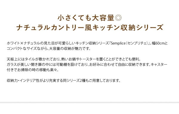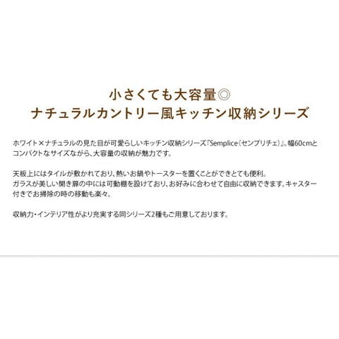 ホワイト×ナチュラルの見た目が可愛らしいキッチン収納シリーズ「Semplice(センプリチェ)」。幅60cmとコンパクトなサイズながら、電子レンジも置ける大容量収納が魅力です。