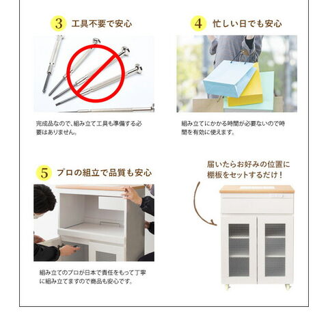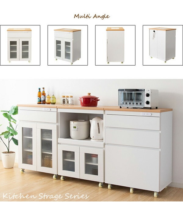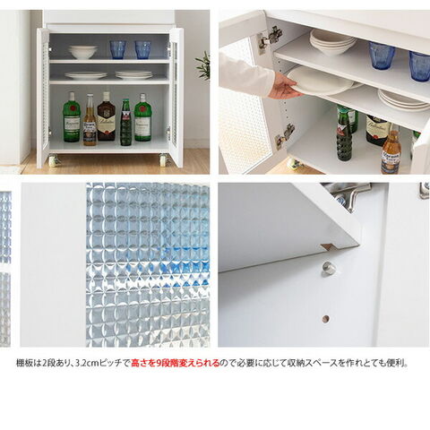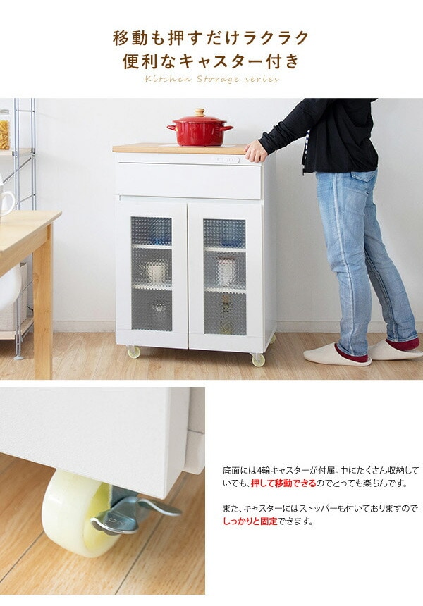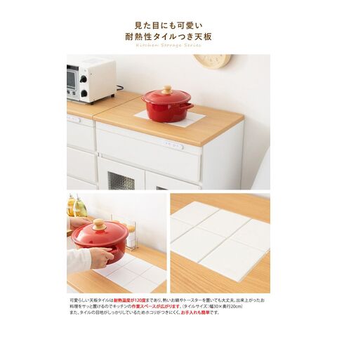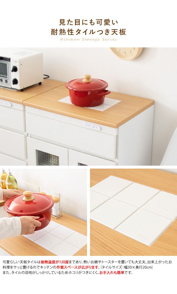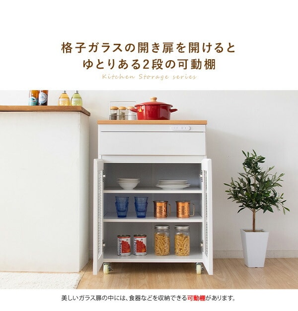 天板上にはタイルが敷かれており、熱いお鍋やトースターを置くことができとても便利。ガラスが美しい開き扉の中には可動棚を設けており、お好みに合わせて自由に収納できます。キャスター付きでお掃除の時の移動も楽々。