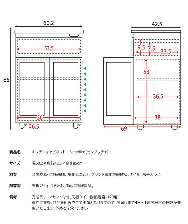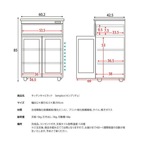 天板:5kg、引き出し:3kg、可動棚:6kg