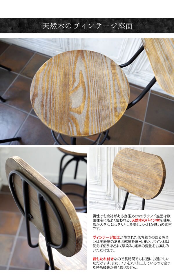 ゆっくりおくつろぎいただける背もたれ付きのヴィンテージ加工された丸い座面と、デザインが目を引く脚フレームはインテリア性もバツグン。