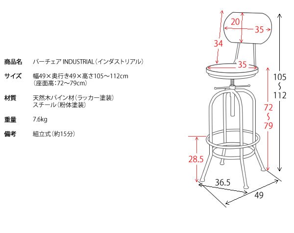 幅49×奥行き49×高さ105~112cm(座面高:72~79cm)