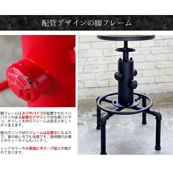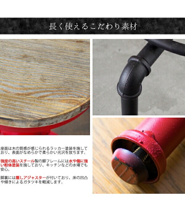 ヴィンテージ加工が施された座面やパイプや配管を模したフレームは置いてあるだけで存在感バツグン。もちろん素材にもこだわっているので丈夫で長くお使いいただけます。