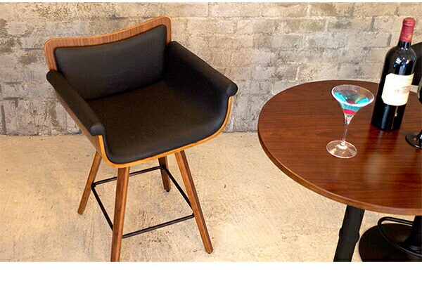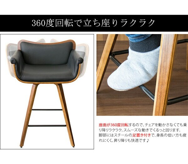 木目の美しい天然木突板と、ブラックの合成皮革がオシャレな雰囲気を演出。座面は360度回転するで立ち座りもラクラク。脚置き付きで身長が低い方も安心です。