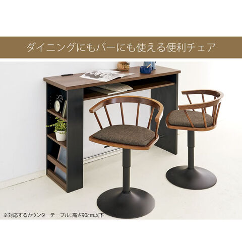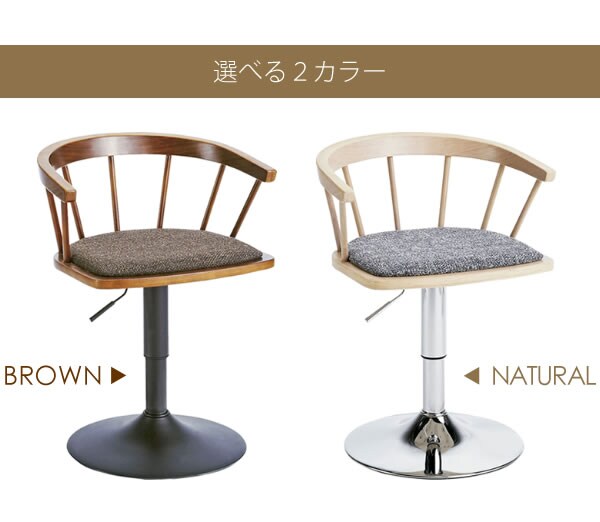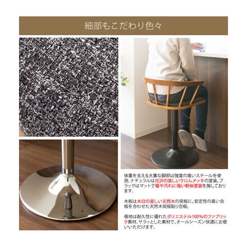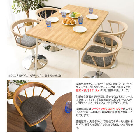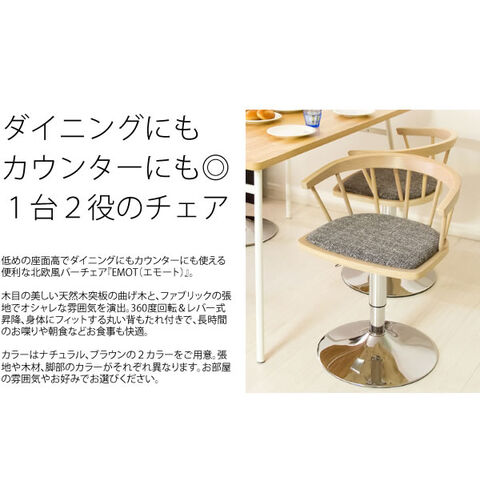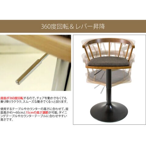木目の美しい天然木突板の曲げ木と、ファブリックの張地でオシャレな雰囲気を演出。360度回転&レバー式昇降、身体にフィットする丸い背もたれ付きで、長時間のお喋りや朝食などお食事も快適。