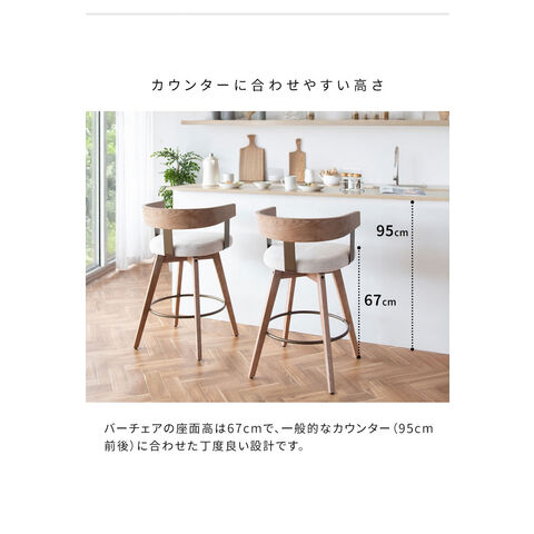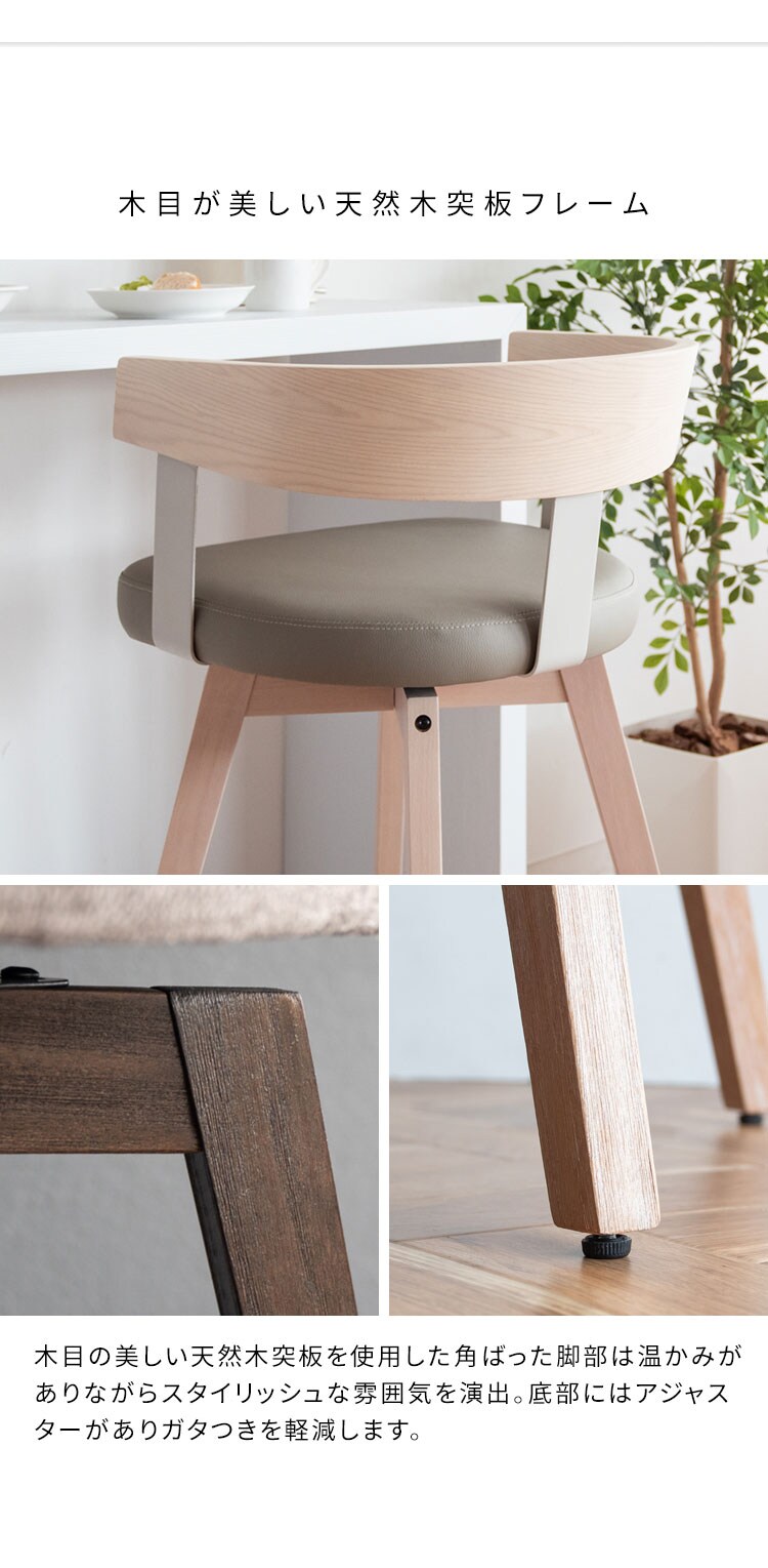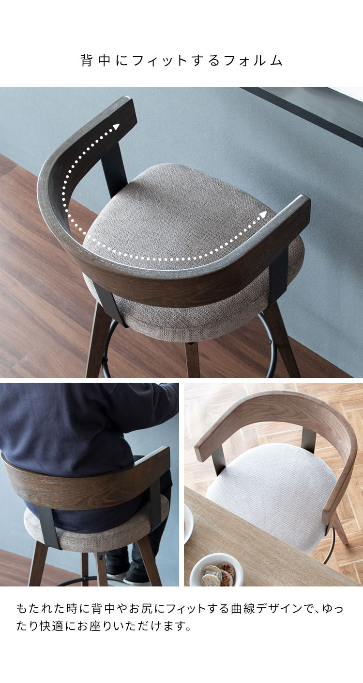 木目が美しい曲げ木フレームが特徴のスタイリッシュなバーチェア『Satio(サティオ)』。ゆったり座れる座面設計とリラックスできる背もたれ付きで快適。足置きと360度回転で立ち座りもラクラクです。