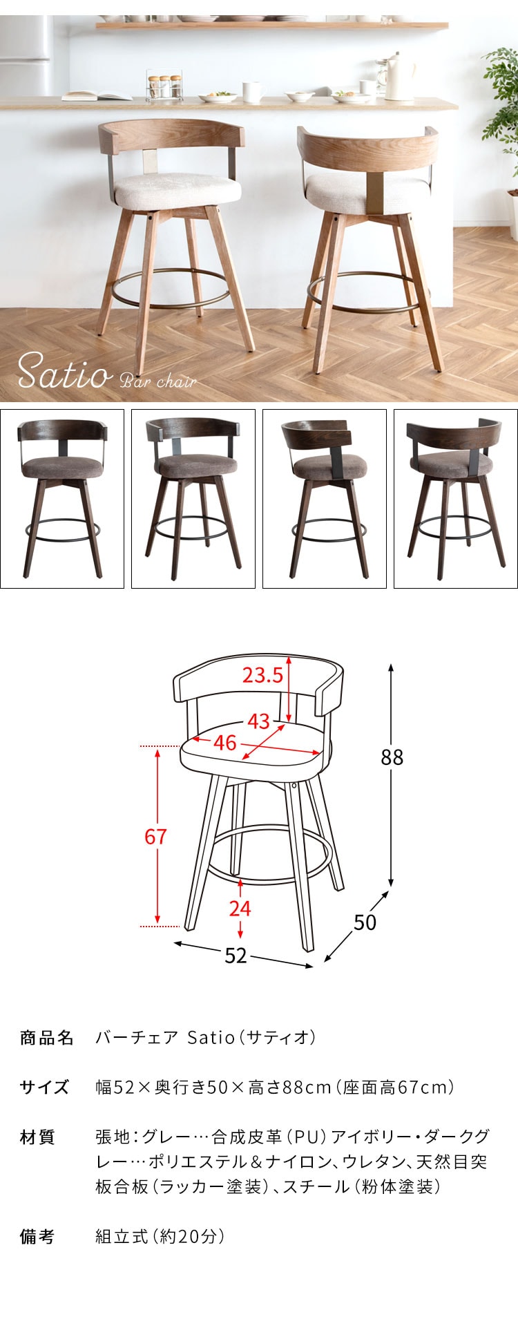 バーチェア Satio サティオ 椅子 ハイチェア カウンターチェア バーカウンター椅子 回転 ウレタン 座面高67cm おしゃれ シンプル かわいい 組立式【送料無料】