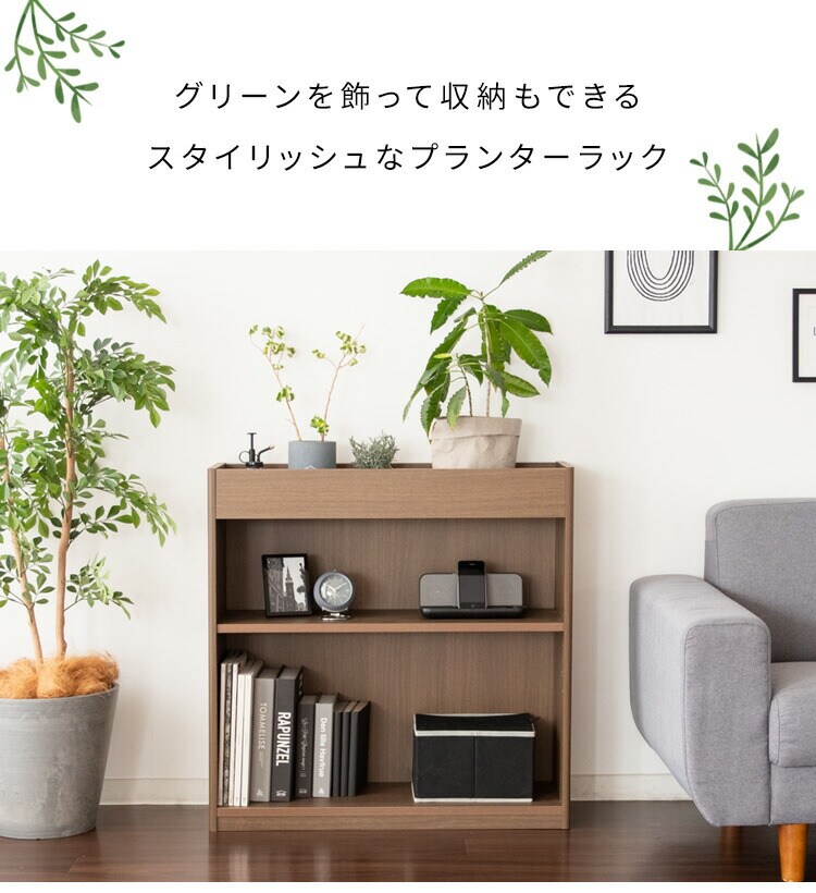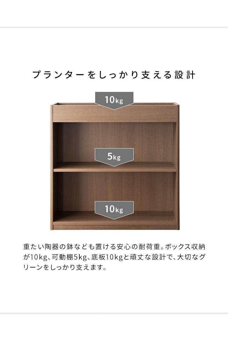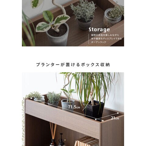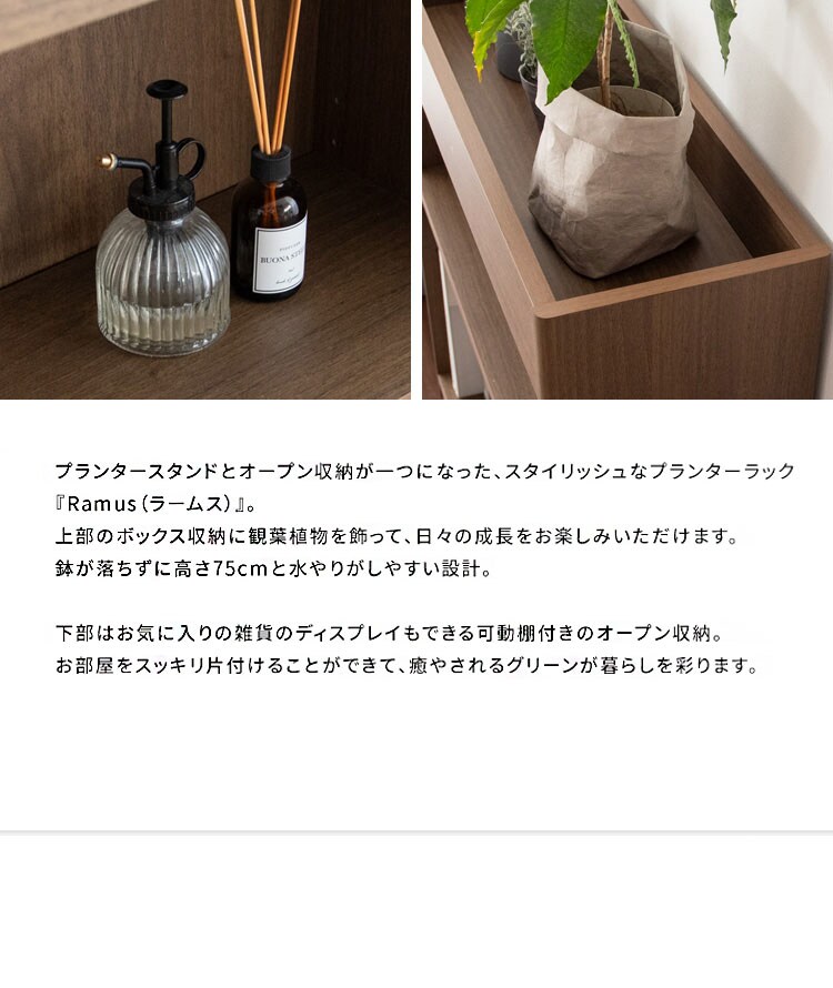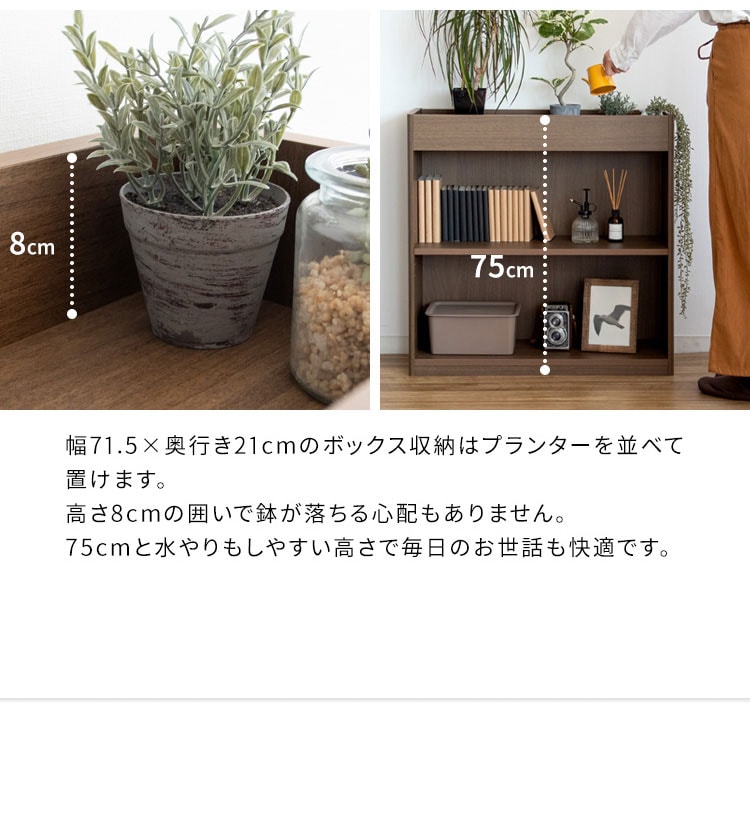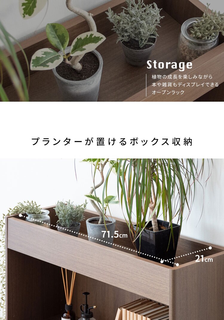 上部のボックス収納に観葉植物を飾って、日々の成長をお楽しみいただけます。鉢が落ちずに高さ75cmと水やりがしやすい設計。