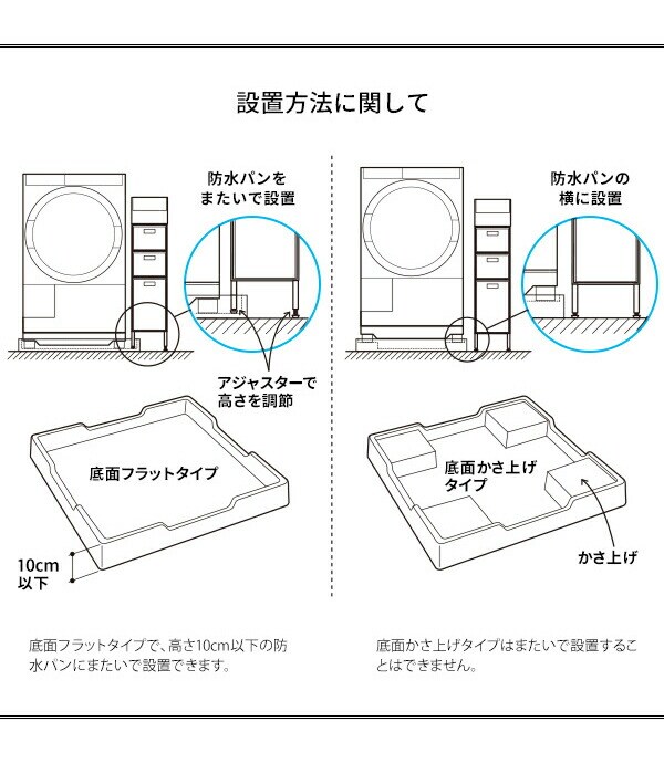 洗面所の隙間に置ける幅15cmのスリムサイズで、アジャスターを調整して防水パンをまたいでの設置も可能です。