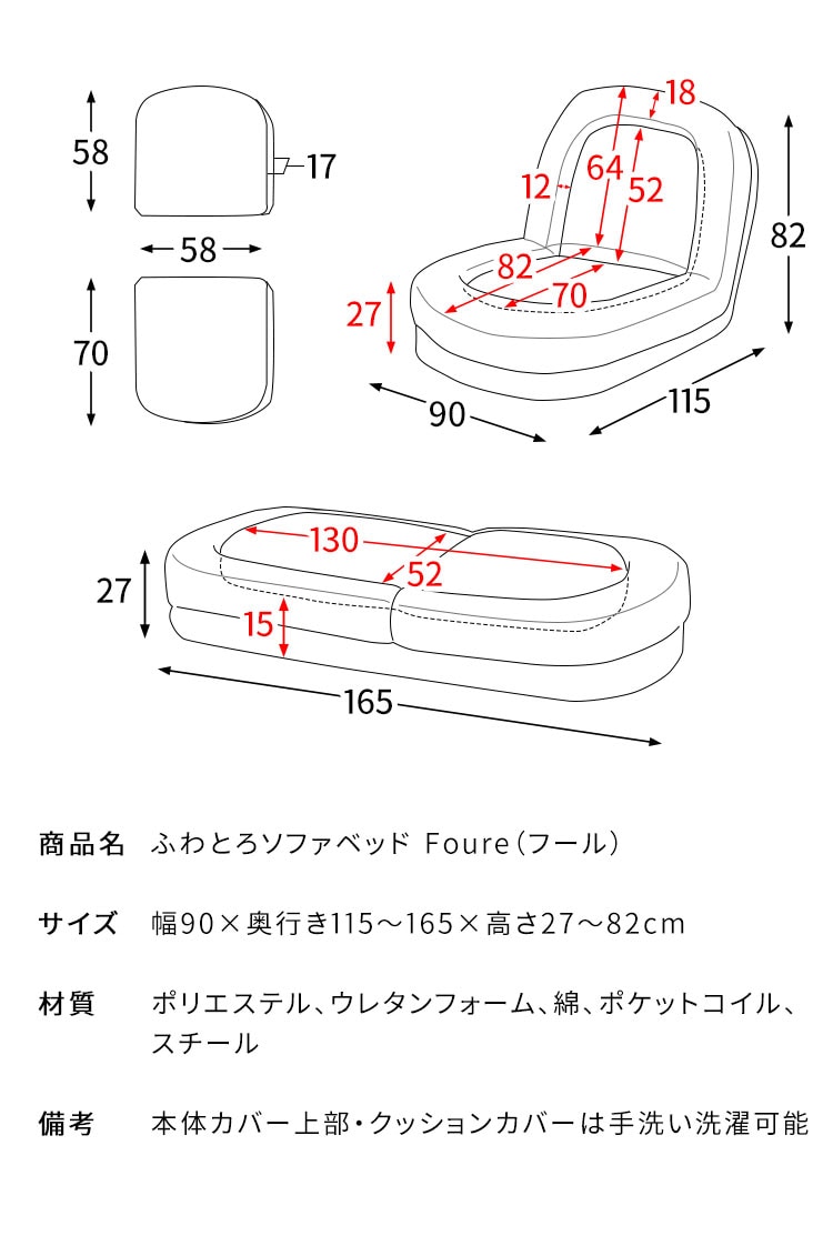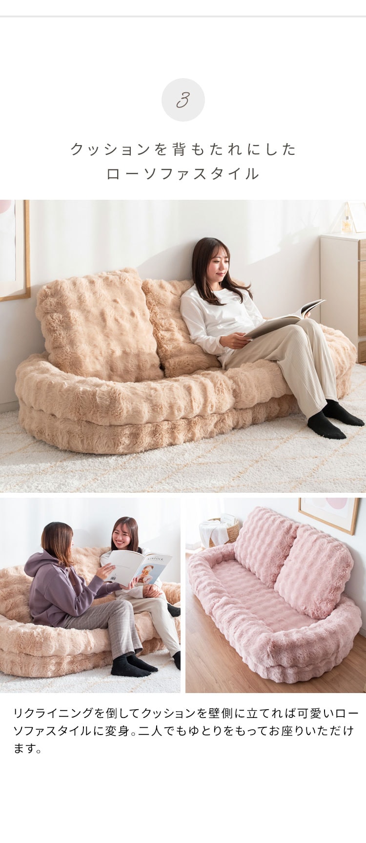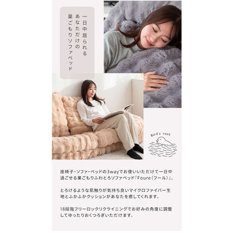 座椅子・ソファ・ベッドの3wayでお使いいただけて一日中過ごせる巣ごもりふわとろソファベッド『Foure(フール)』。とろけるような肌触りが気持ち良いマイクロファイバー生地とふかふかクッションがあなたを癒してくれます。