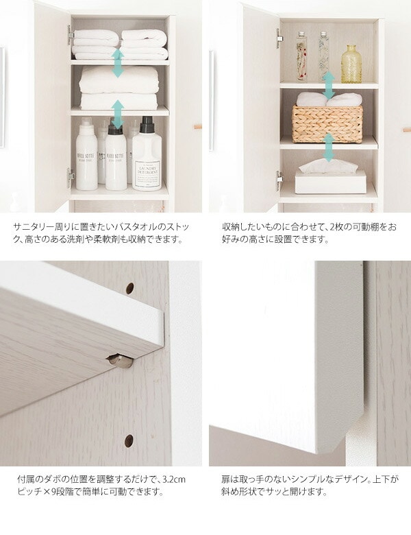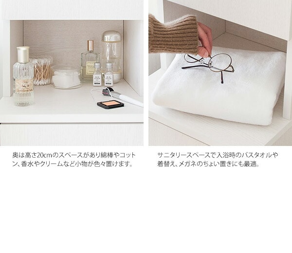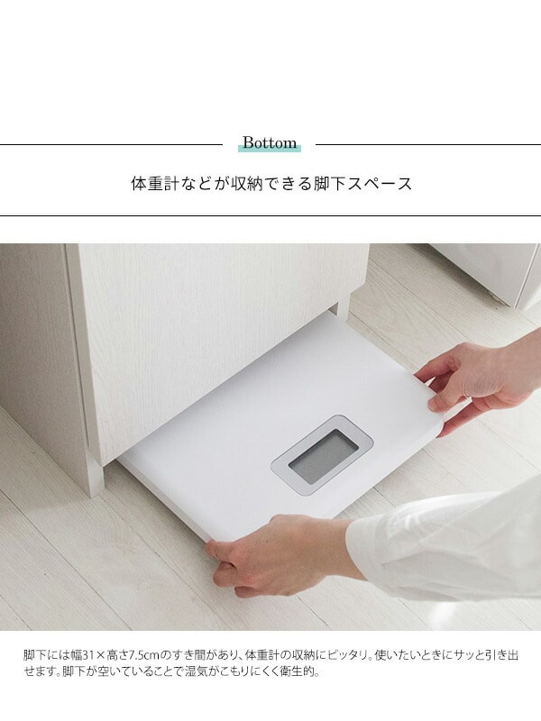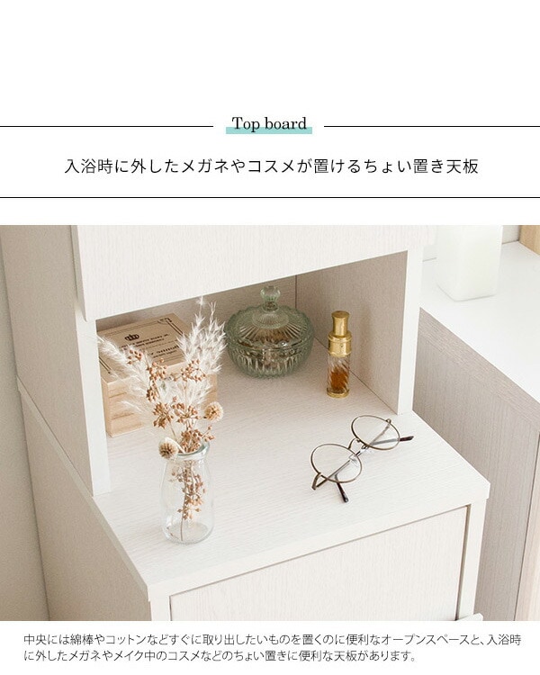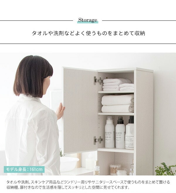 可動式の棚で洗剤や小物が収納できる収納棚、入浴時に外したメガネやコスメが置ける天板、脱いだ服やタオルを隠しながら入れられる扉付きの洗濯カゴスペース等々、スリムでも収納力や実用性が高いデザイン。