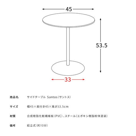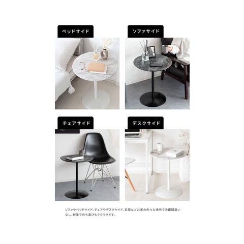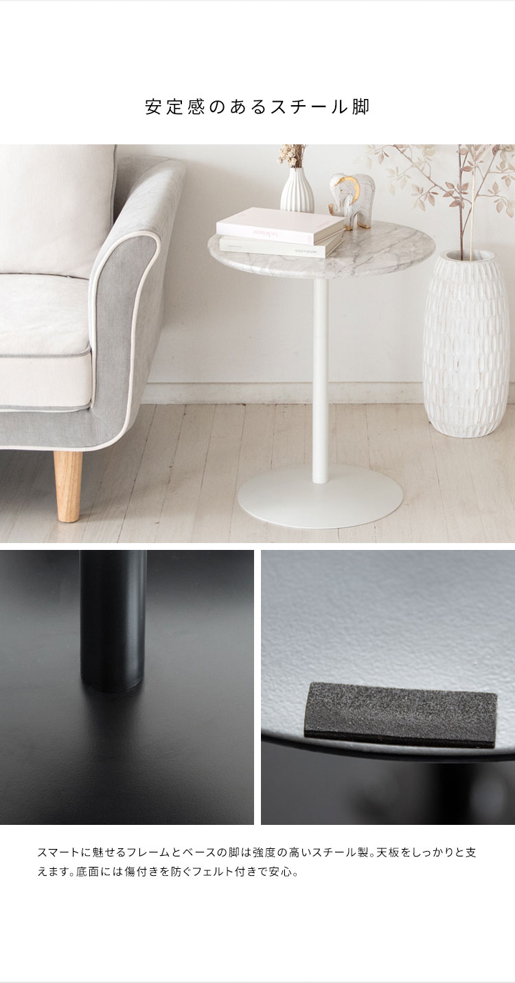 直径45cmとちょうど良い大きさのラウンド天板と、安定性のあるシンプルなスチール脚は使いやすくリビングや寝室、玄関などお家の色々な場所で活躍間違いなし。