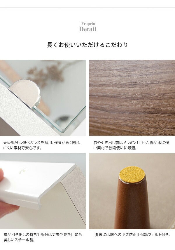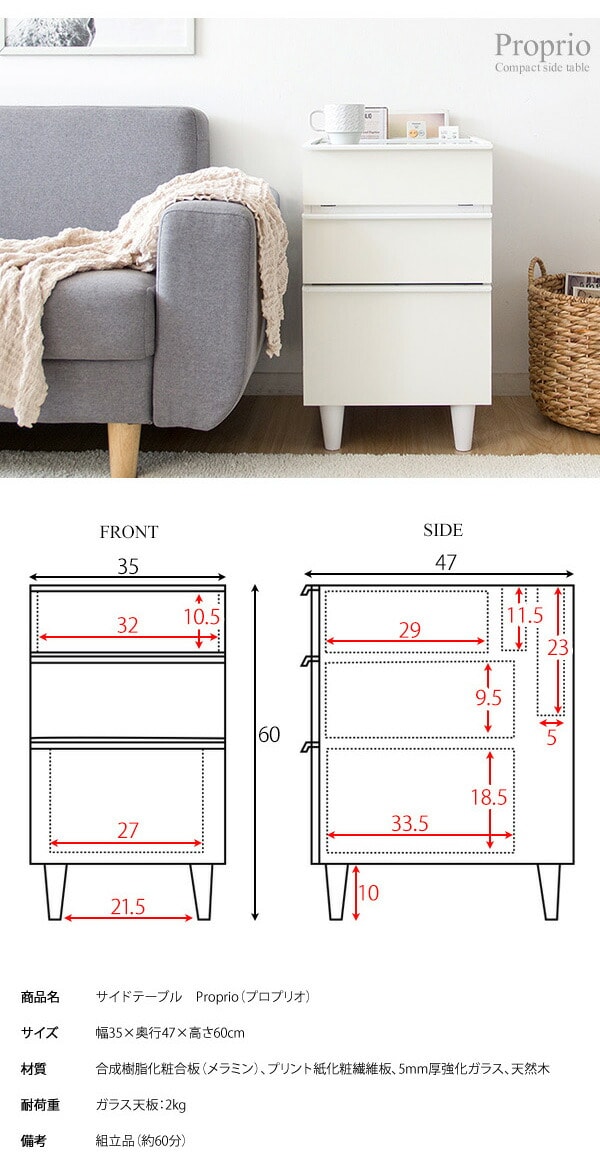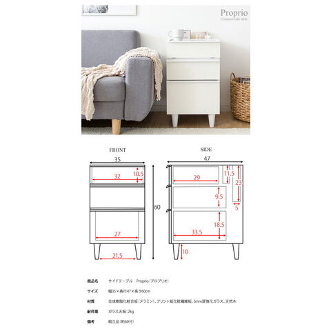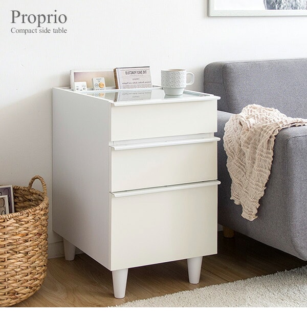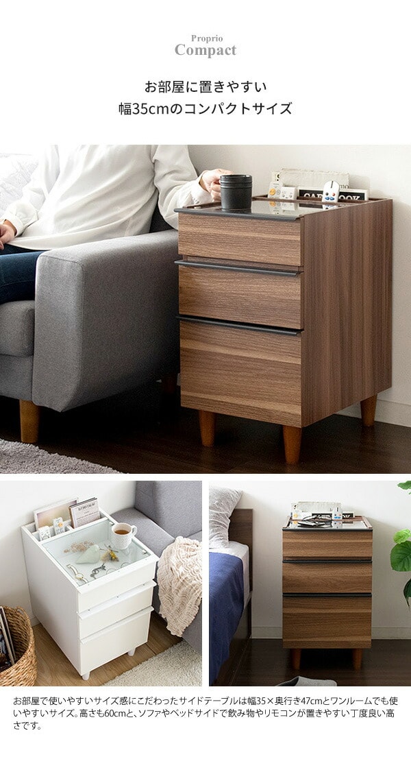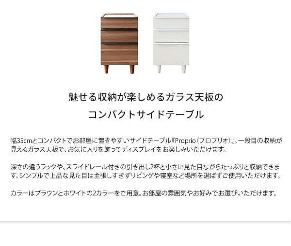 幅35cm、高さ60cmとコンパクトでお部屋に置きやすいサイドテーブル『Proprio(プロプリオ)』。上部はガラス天板を採用しており、魅せる収納が叶います。