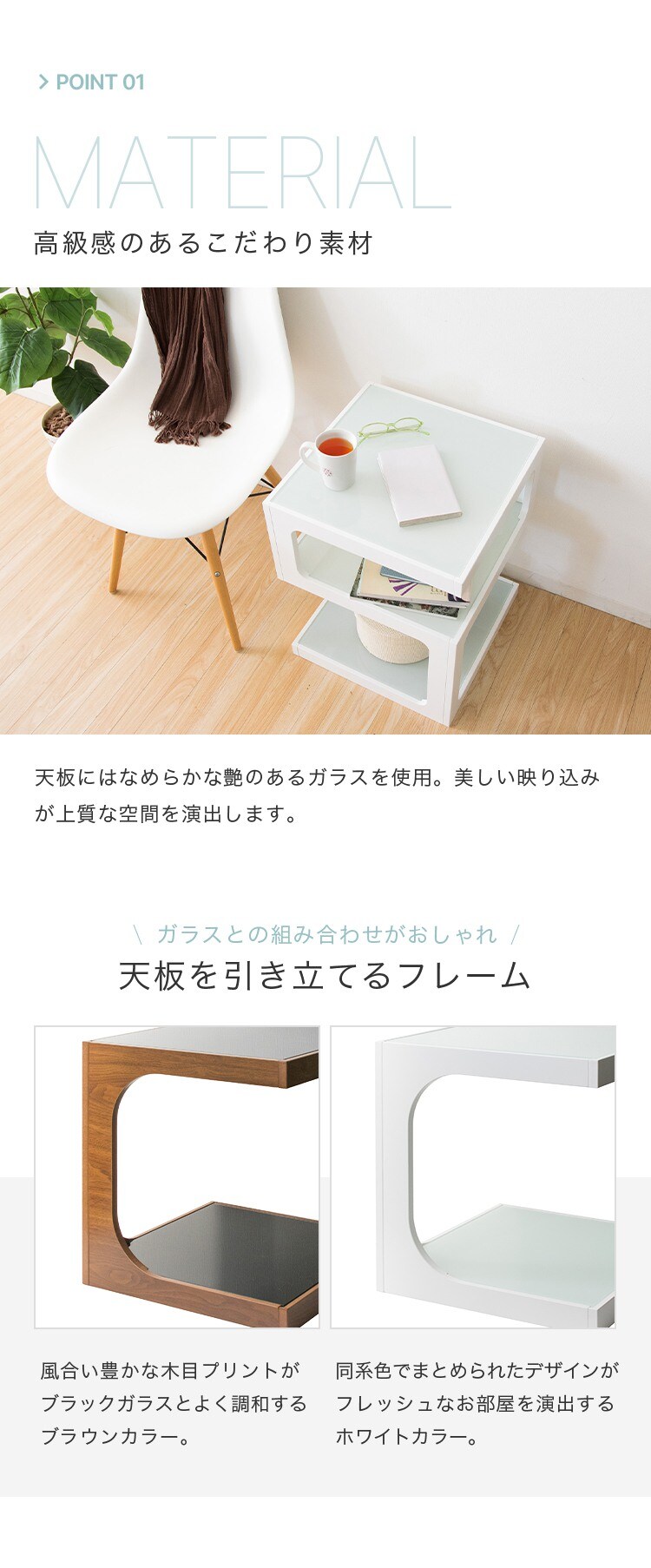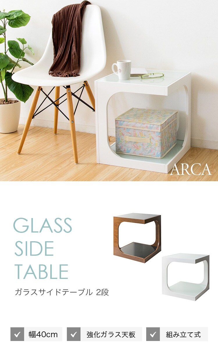 サイドテーブル ガラス 幅40cm ホワイト ブラウン 2段 コの字型 ARCA(アルカ) スタイリッシュ キューブ型 ベッドサイド ソファサイド シンプル 北欧 おしゃれ ミニテーブル ナイトテーブル コーヒーテーブル 【送料無料】