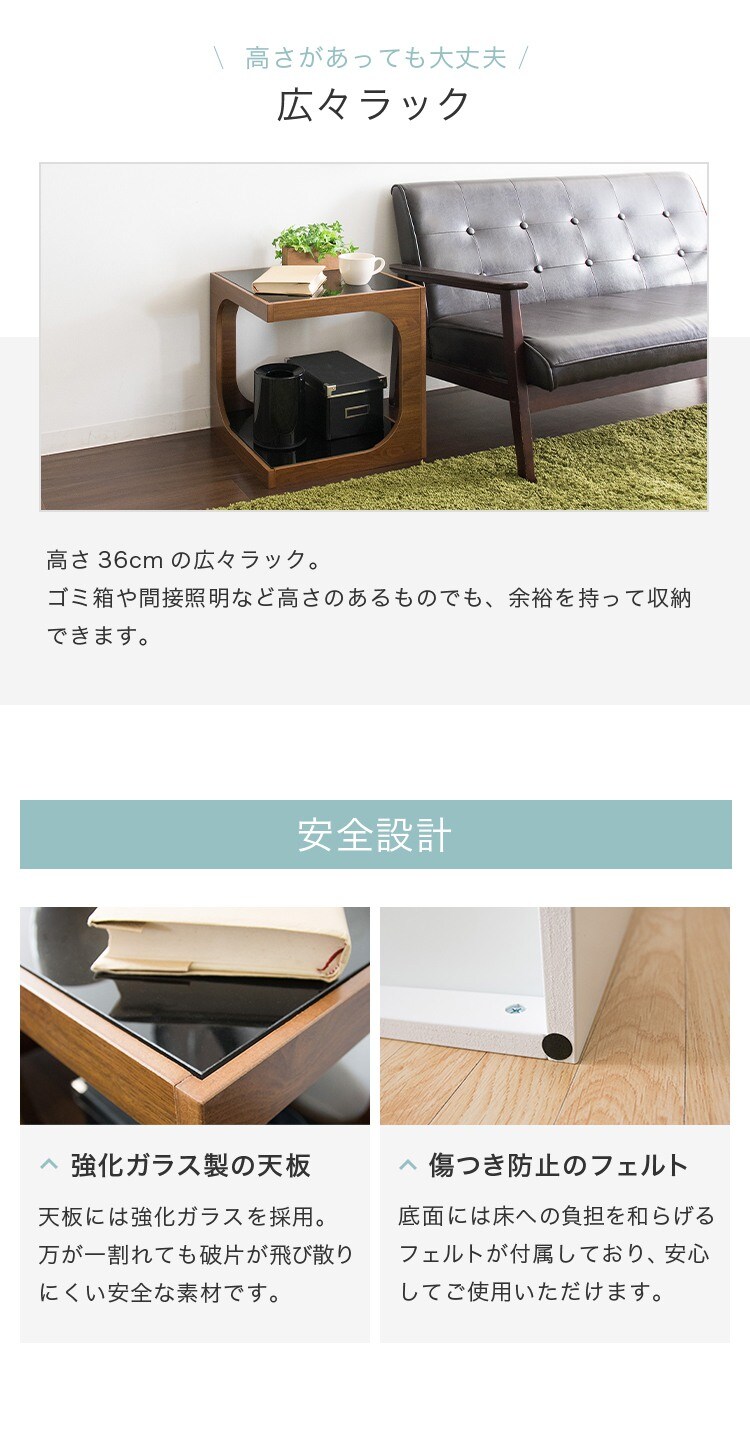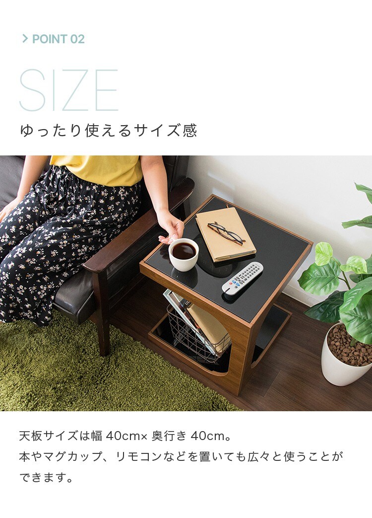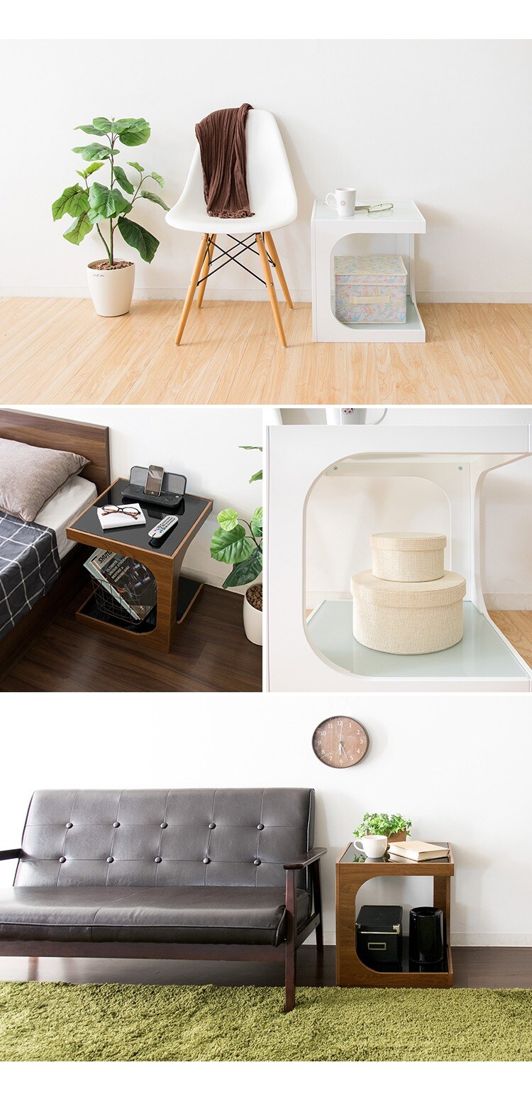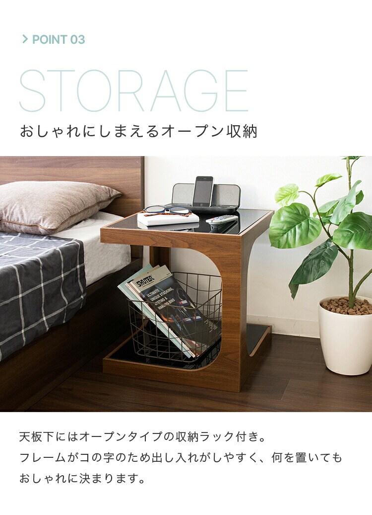 ソファやベッドサイドでちょっとした物を置くのに最適。天板の下はガラス板のおしゃれなオープンスペース。高さのあるものも収納できます。
